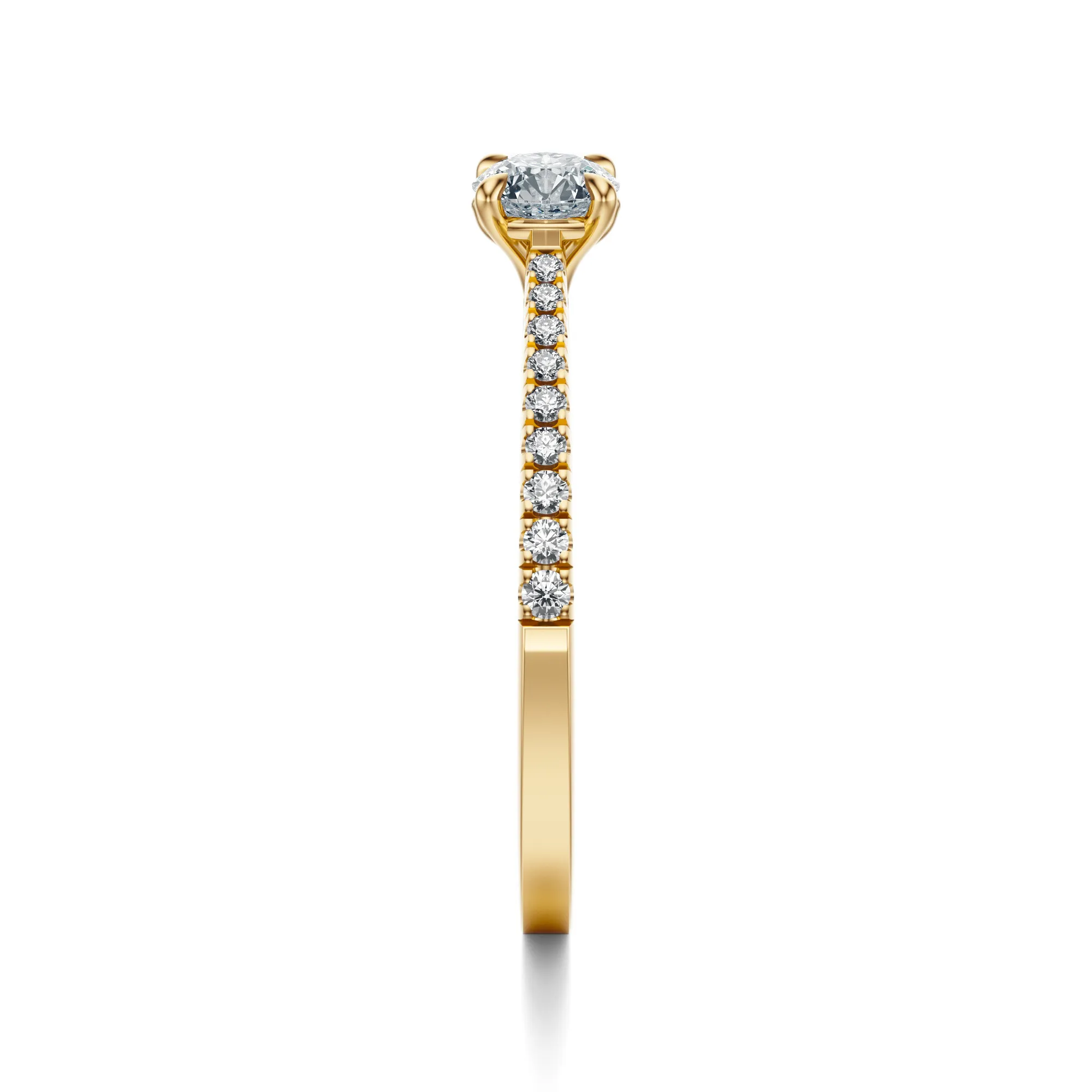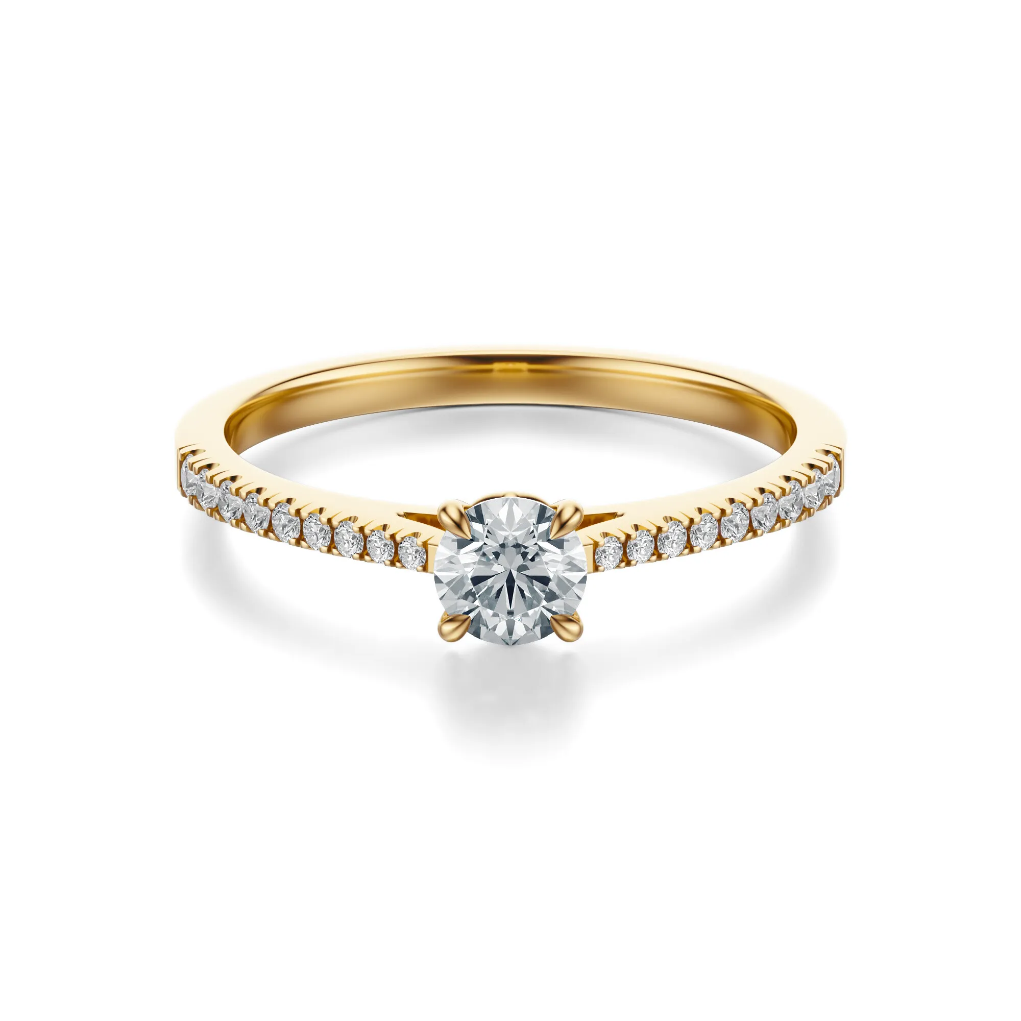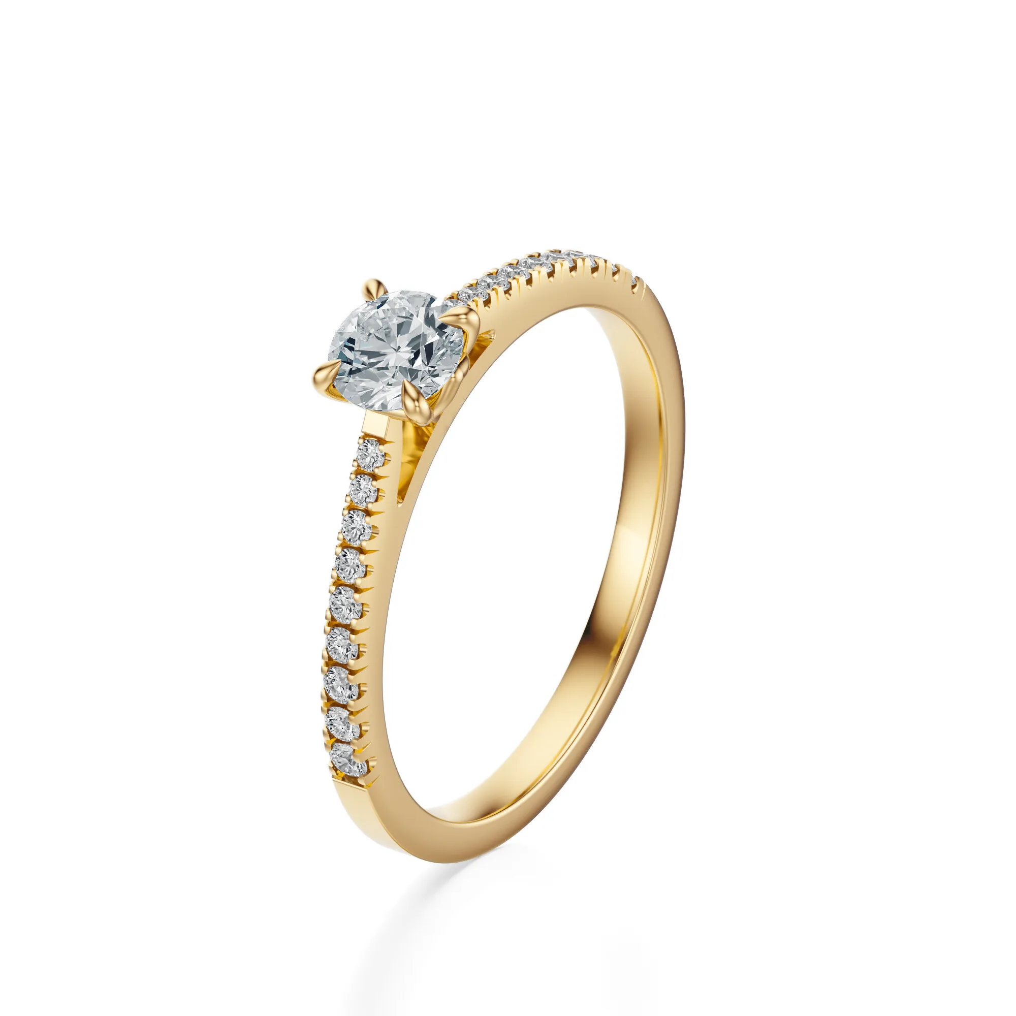Zjawiskowy pierścionek wykonany ze złota o próbie 585 w ciepłym odcieniu żółtego złota zachwyca elegancją i ponadczasowym wdziękiem. Jego wyrafinowana forma oraz precyzyjne osadzenie kamieni czynią z niego biżuterię, która oczarowuje subtelnym, ale intensywnym blaskiem. Główną rolę odgrywa tu okrągły diament, którego klasyczny szlif brilliant wspaniale odbija światło, podkreślając luksusowy charakter kompozycji.