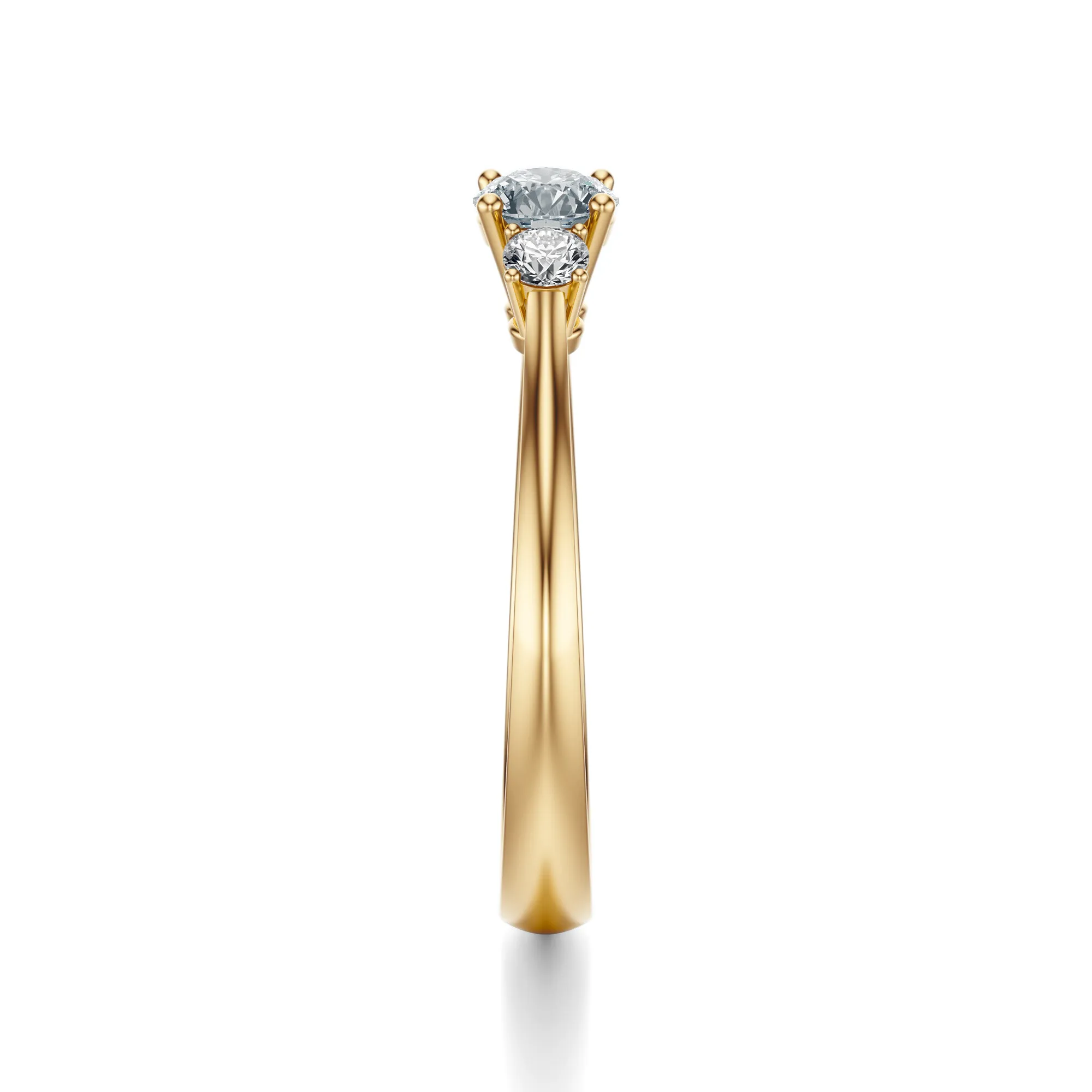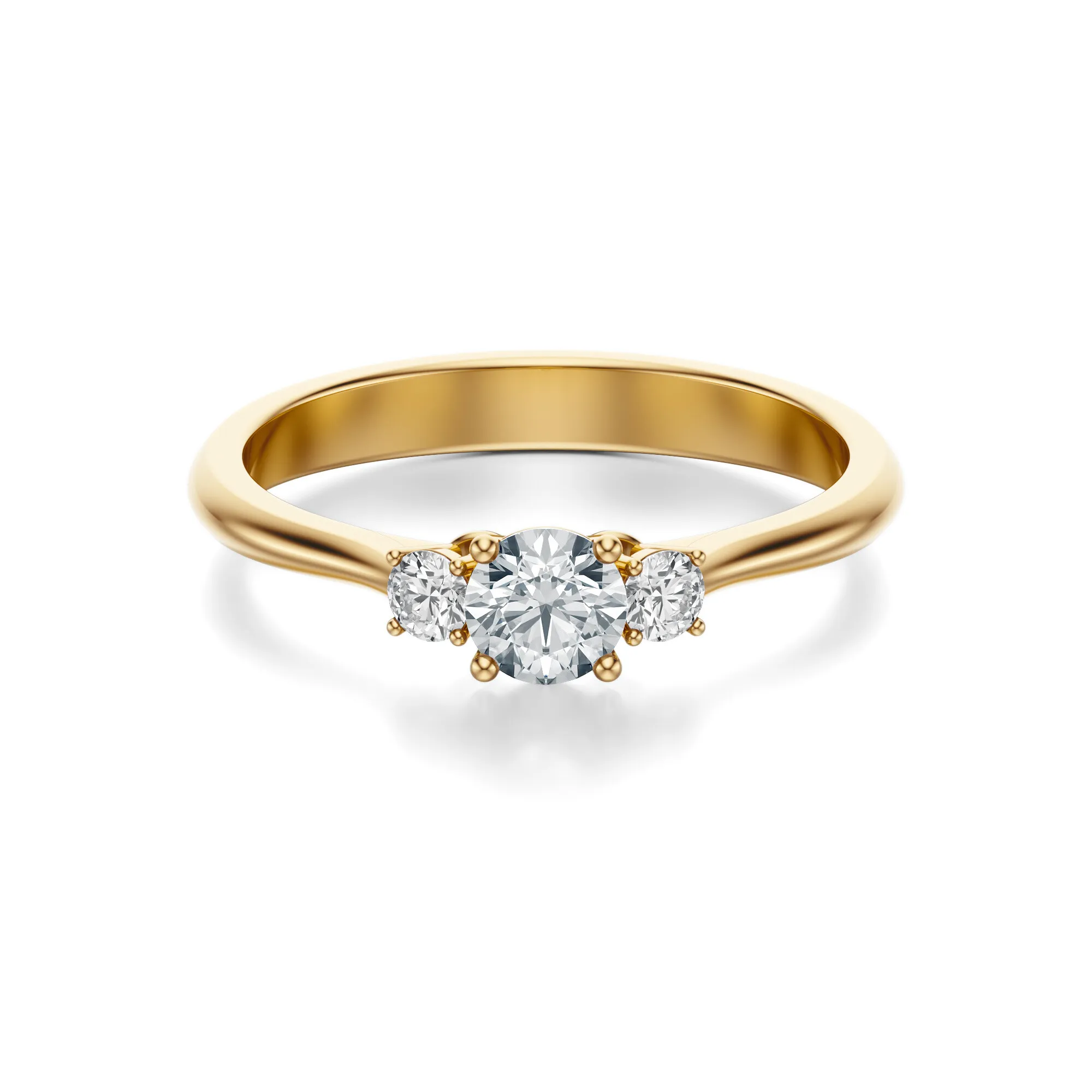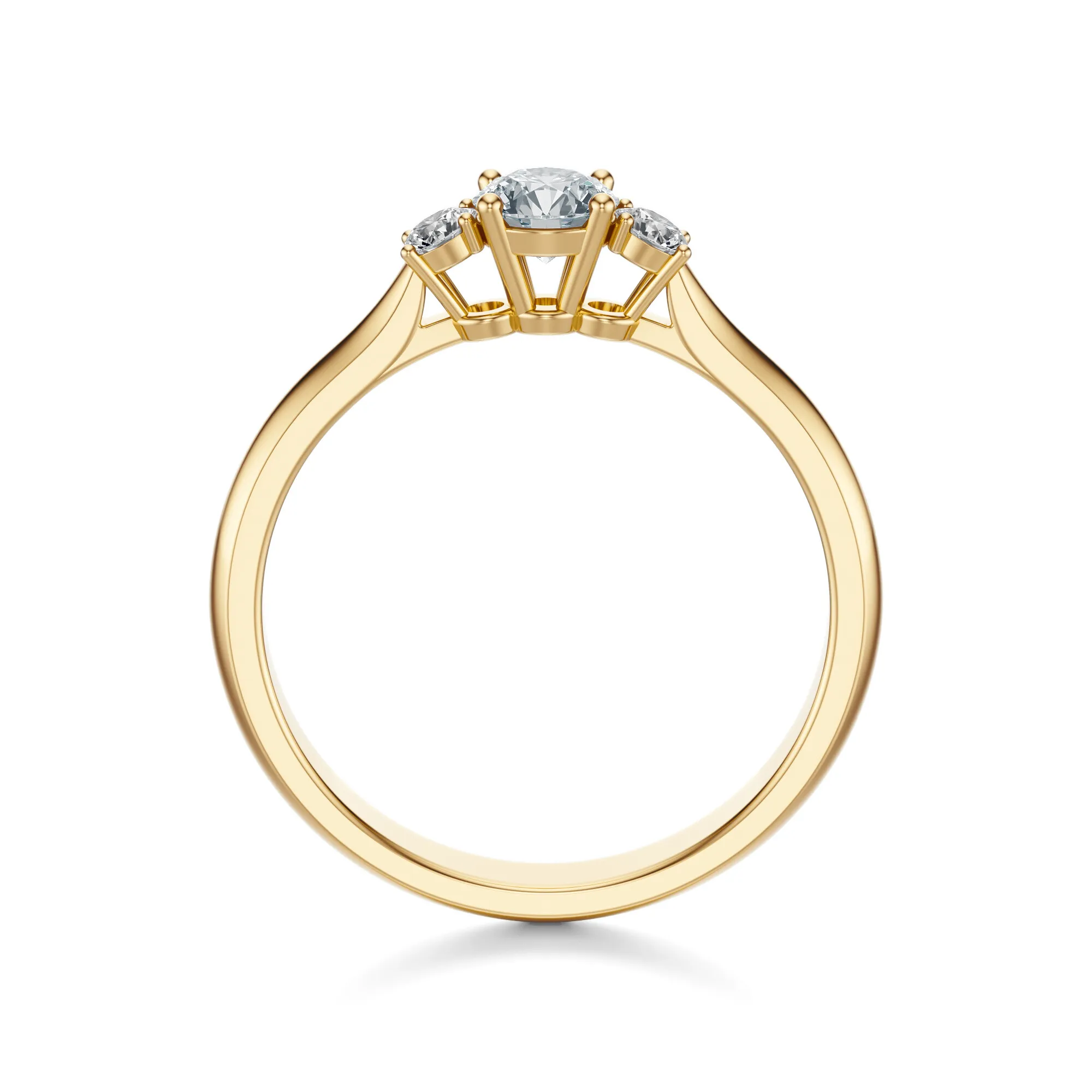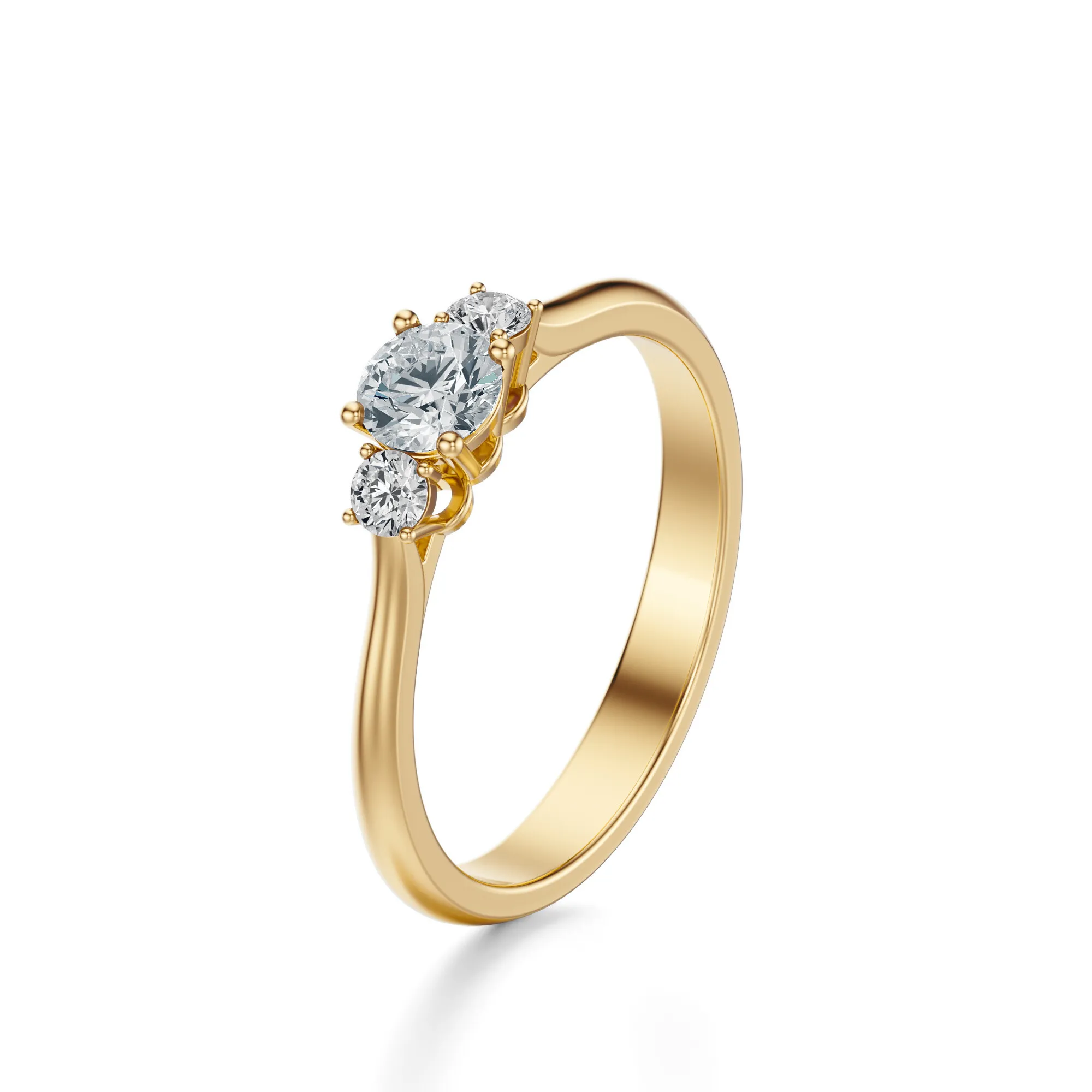Centralny brylant przyciąga uwagę doskonałą symetrią i wyjątkowym szlifem, a towarzyszące mu dwa mniejsze kamienie po bokach tworzą idealnie zrównoważoną kompozycję. Subtelne łapki oprawy dodają lekkości, eksponując pełnię piękna każdego diamentu. Ten klasyczny pierścionek zaręczynowy to doskonały wybór dla osób ceniących prostotę, jakość i emocjonalną głębię formy.