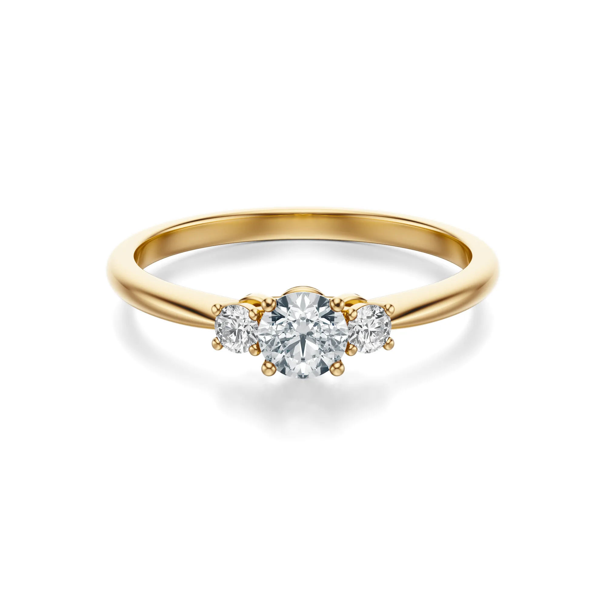 Elegancja zaklęta w subtelnej formie – ten pierścionek zaręczynowy z diamentami zachwyca klasyczną estetyką i ponadczasowym urokiem. Wykonany ze złota o próbie 585 w odcieniu ciepłego, żółtego złota, stanowi doskonałe połączenie tradycji i nowoczesności. Centralnie osadzony, olśniewający diament otoczony jest dwoma mniejszymi kamieniami, tworząc harmonijną kompozycję o intensywnym blasku i wyrafinowanej lekkości.