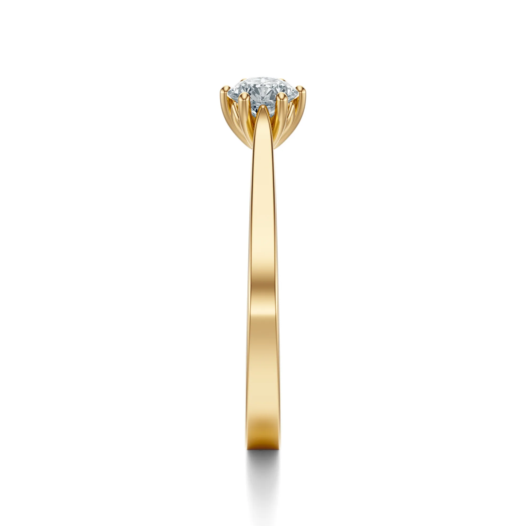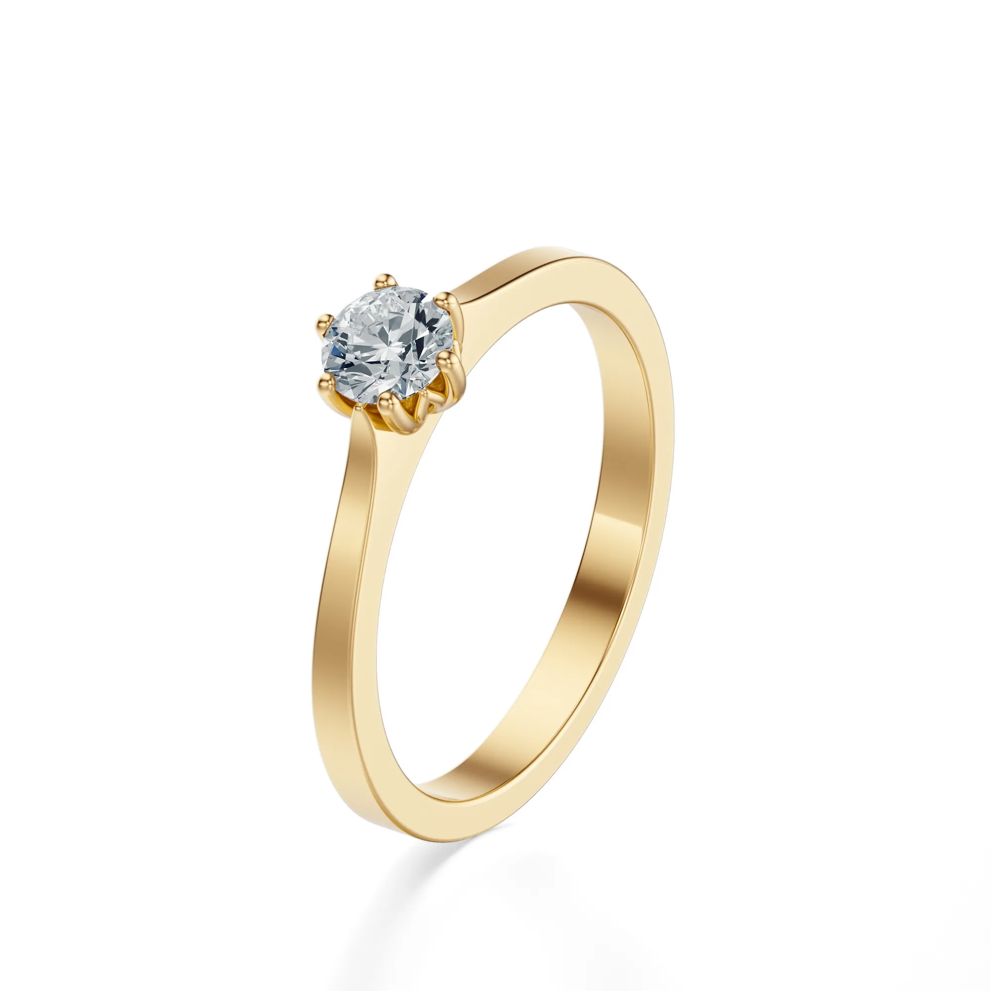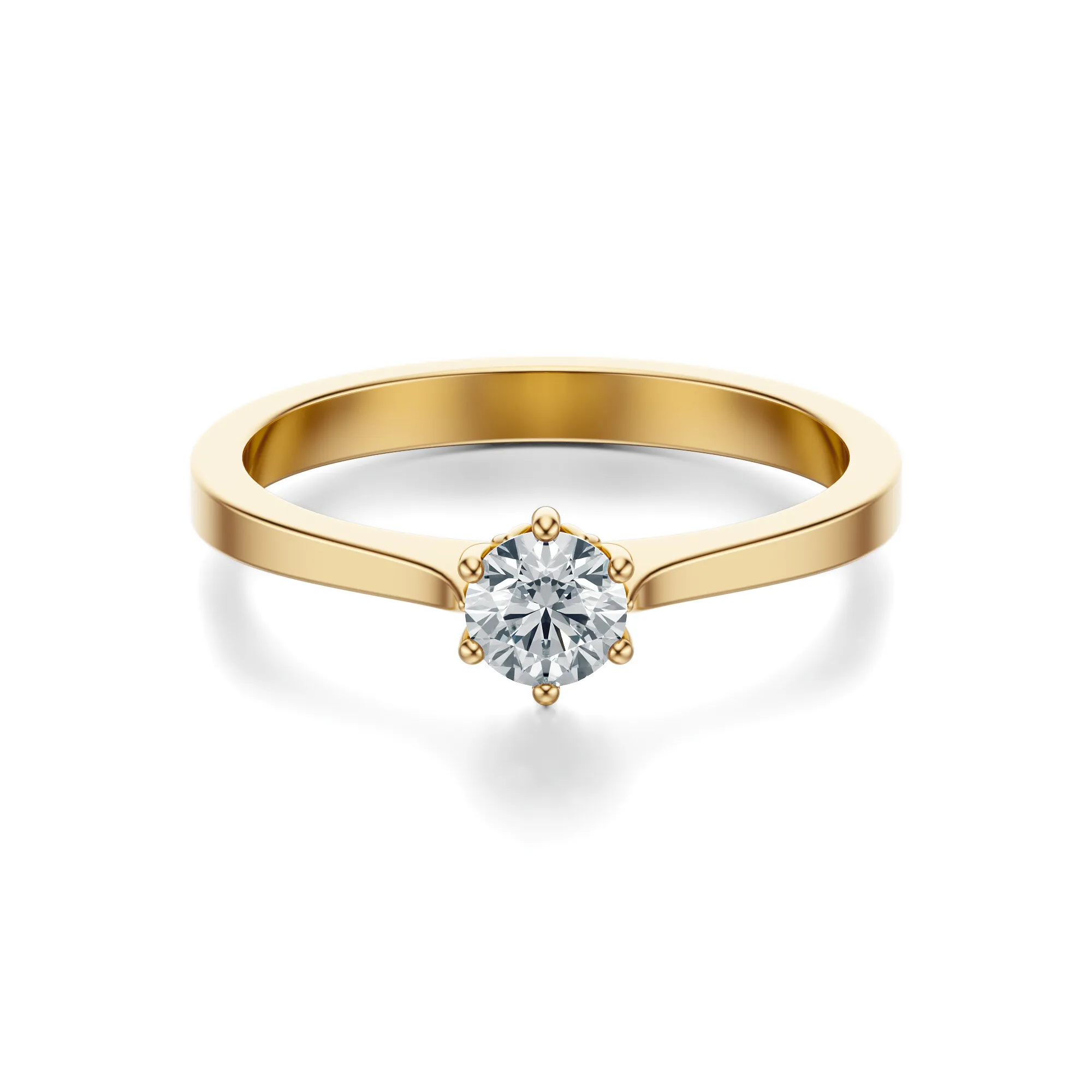 Ten wyjątkowy pierścionek zaręczynowy z żółtego złota zachwyca swoją prostotą, szlachetnością formy i imponującym blaskiem centralnego diamentu. Wykonany z żółtego złota o próbie 585, łączy klasyczny kunszt jubilerski z elegancją, która nigdy nie wychodzi z mody. Okrągły diament osadzony w sześciu delikatnych łapkach stanowi centralny punkt kompozycji, emanując światłem i czystością.