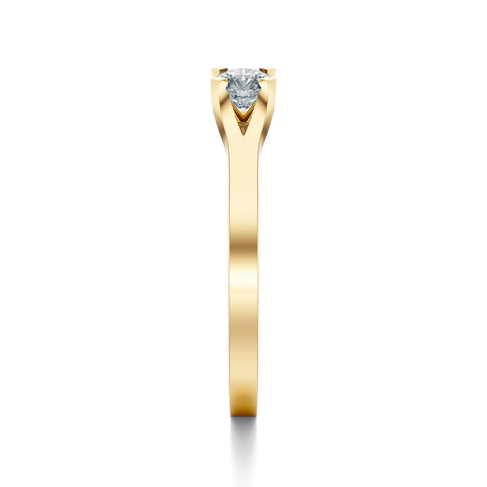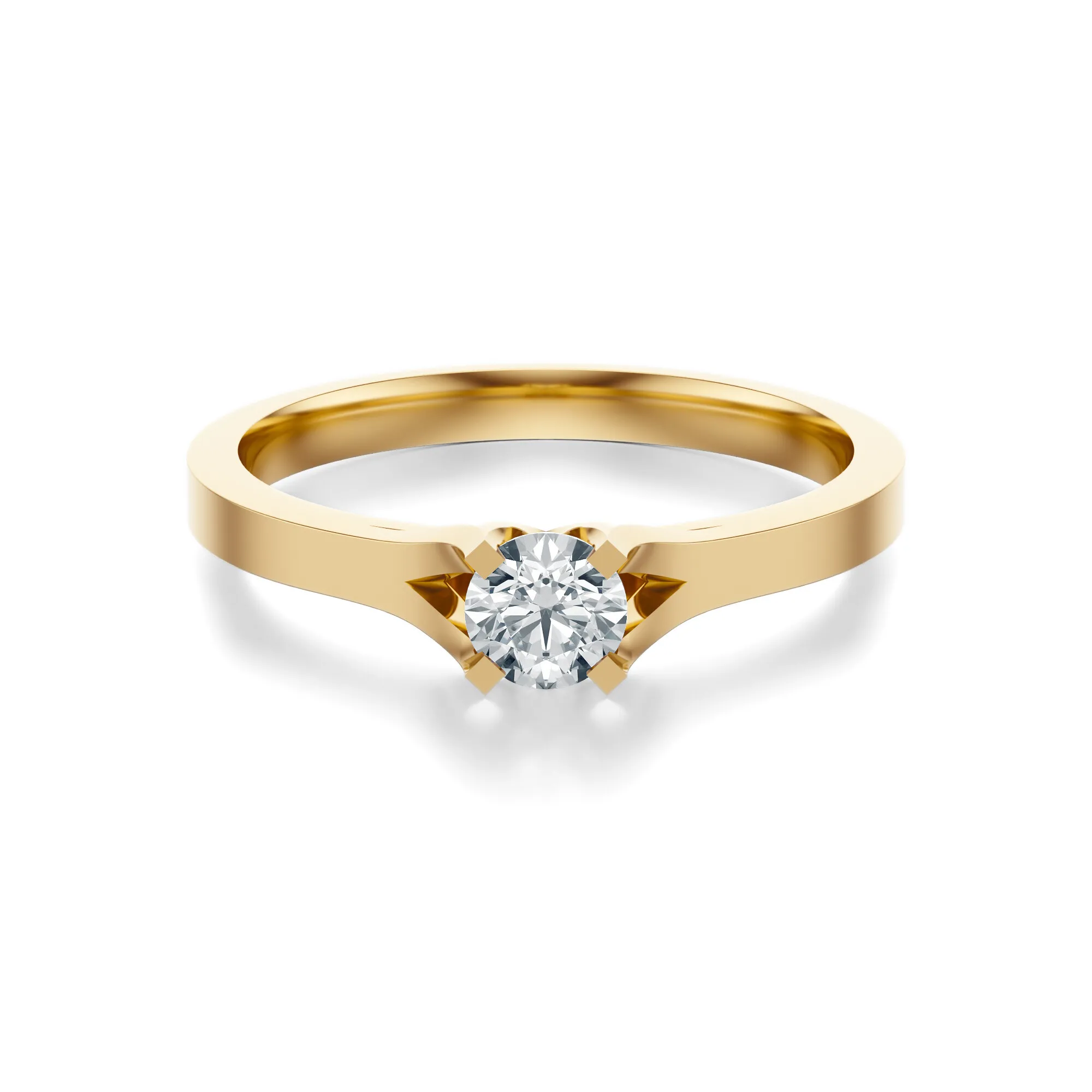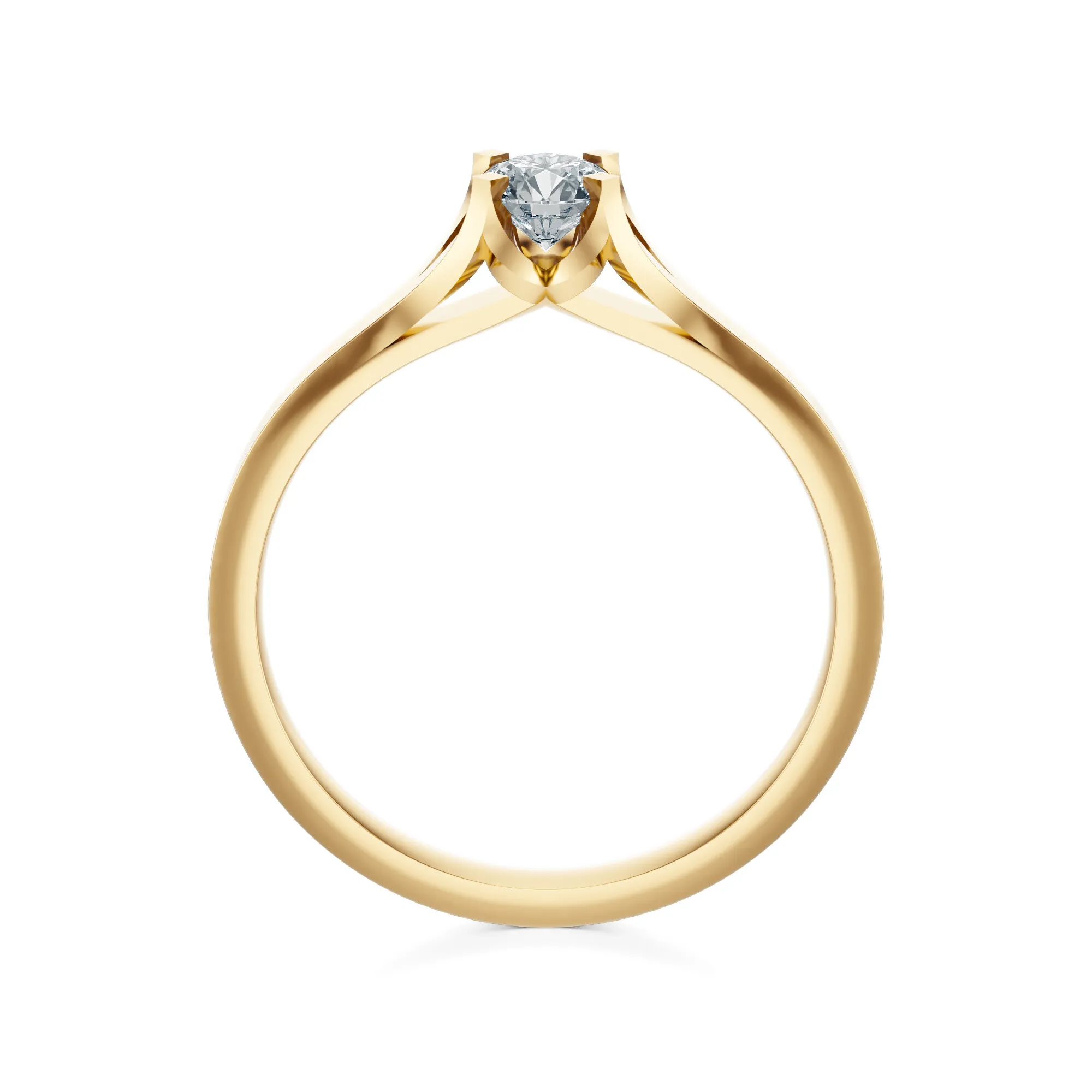 Ten elegancki pierścionek zaręczynowy z żółtego złota urzeka swoją ponadczasową formą i szlachetnym blaskiem. Wykonany ze złota o próbie 585, łączy subtelność klasyki z dyskretnym luksusem. Centralnie osadzony okrągły diament w koronie z czterech łapek przyciąga wzrok intensywnym połyskiem, stanowiąc doskonały akcent dla stylowej i wymagającej kobiety.