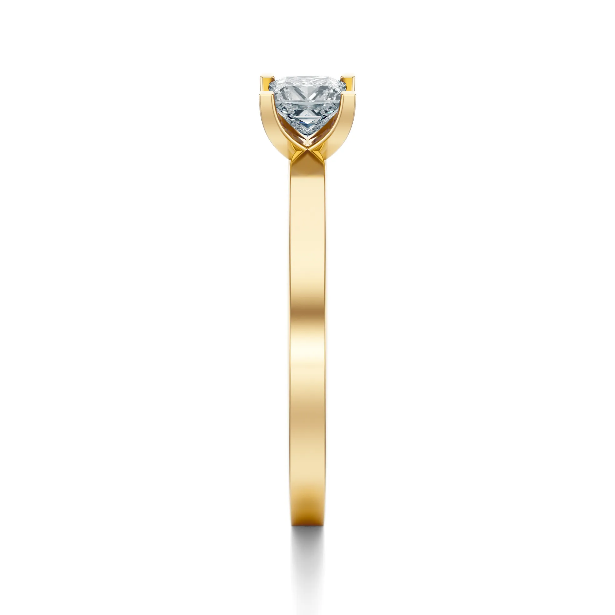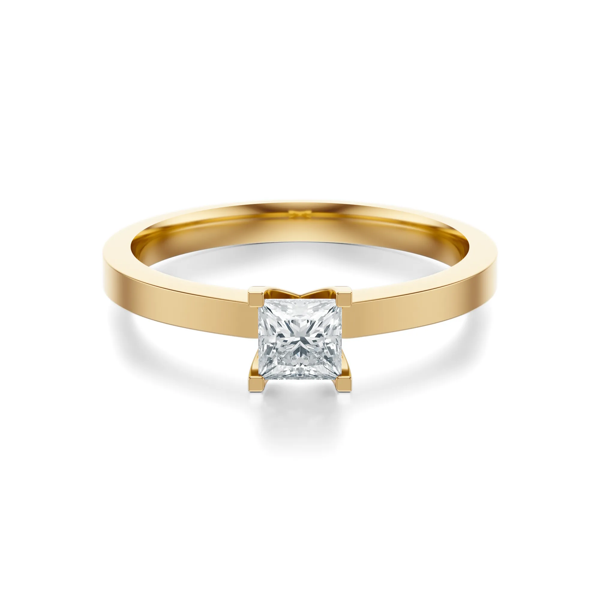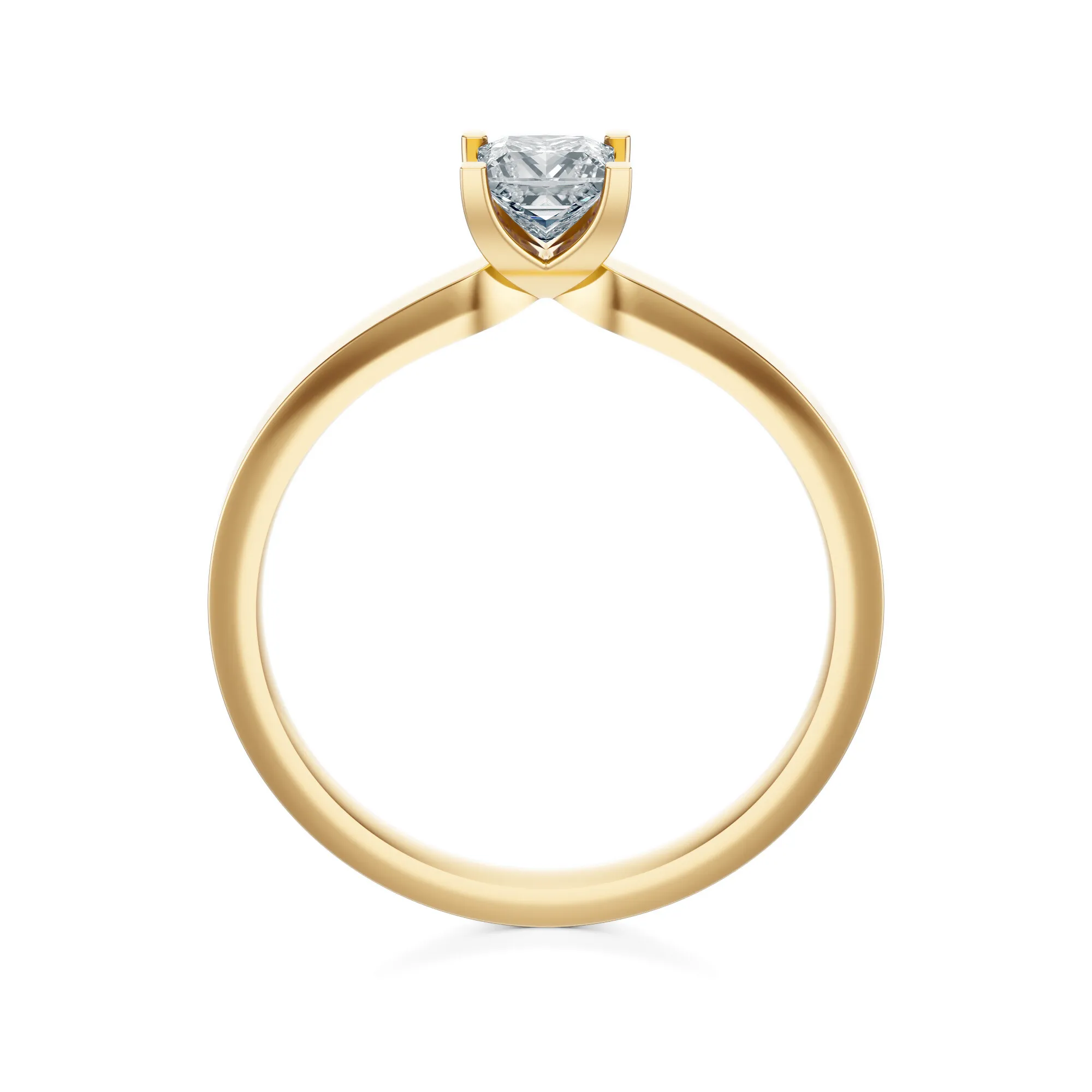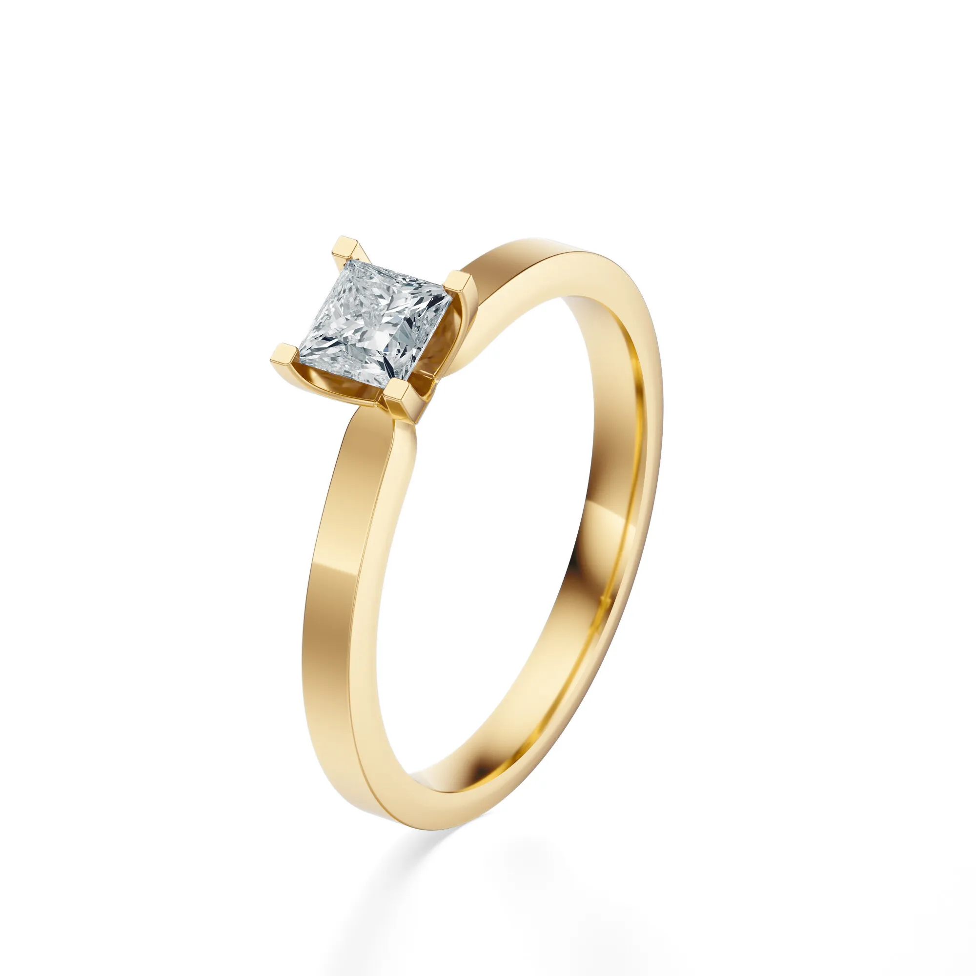Ten elegancki pierścionek zaręczynowy wykonany został z żółtego złota o próbie 585 i zdobiony pojedynczym diamentem w szlifie princessa. Zachwyca prostotą formy i ponadczasowym urokiem, a jego geometryczna oprawa dodaje całości nowoczesnego charakteru. Diament w centralnym punkcie przyciąga wzrok intensywnym blaskiem i wyrafinowaną precyzją cięcia.