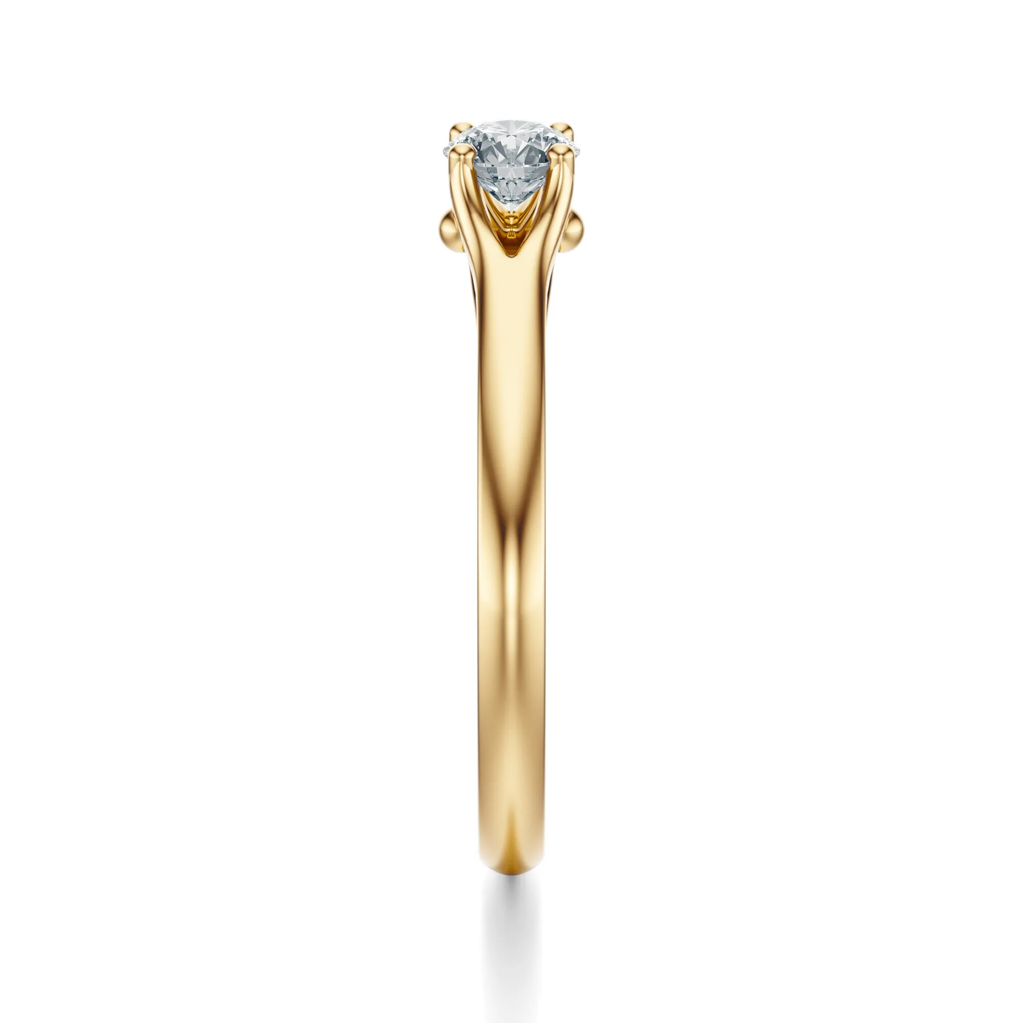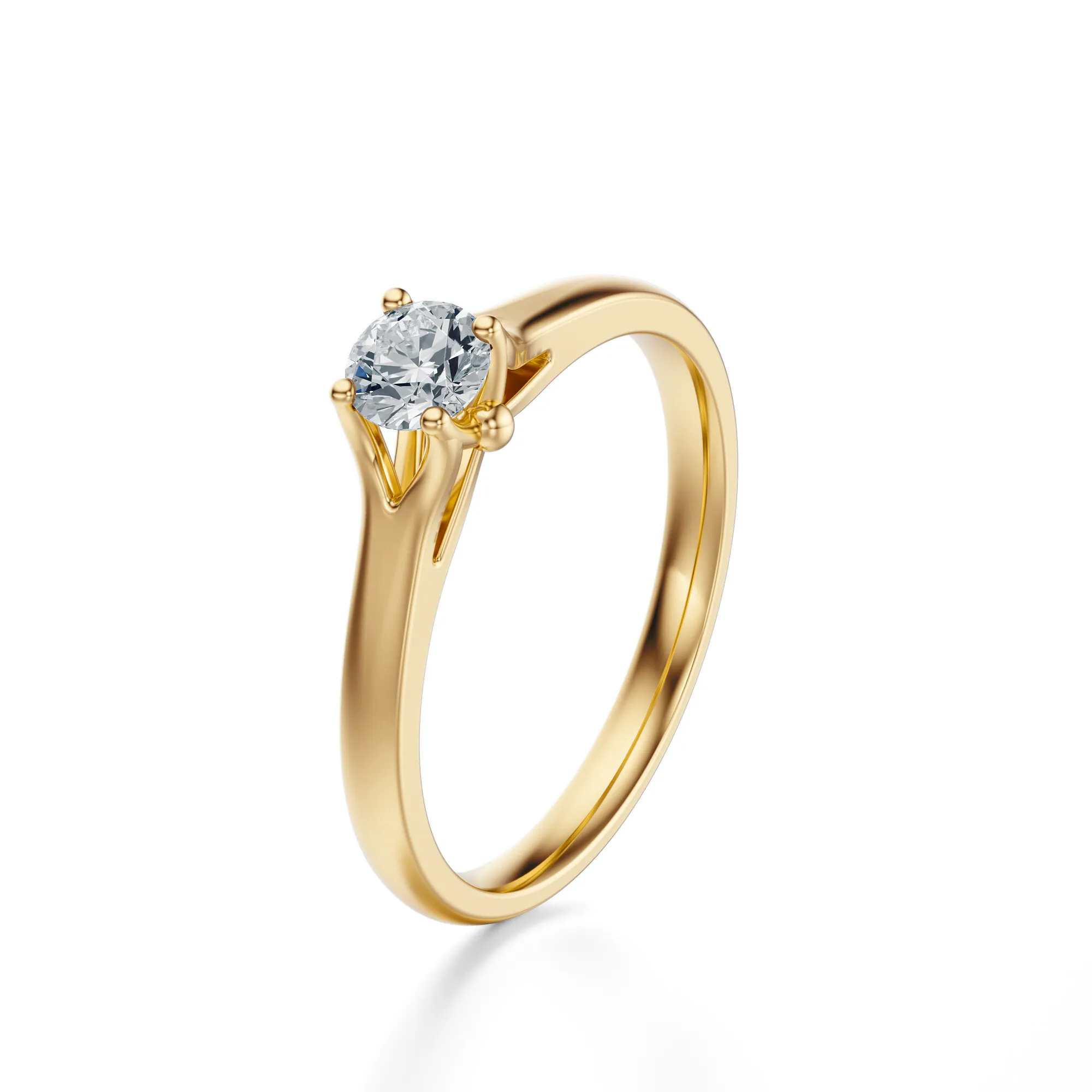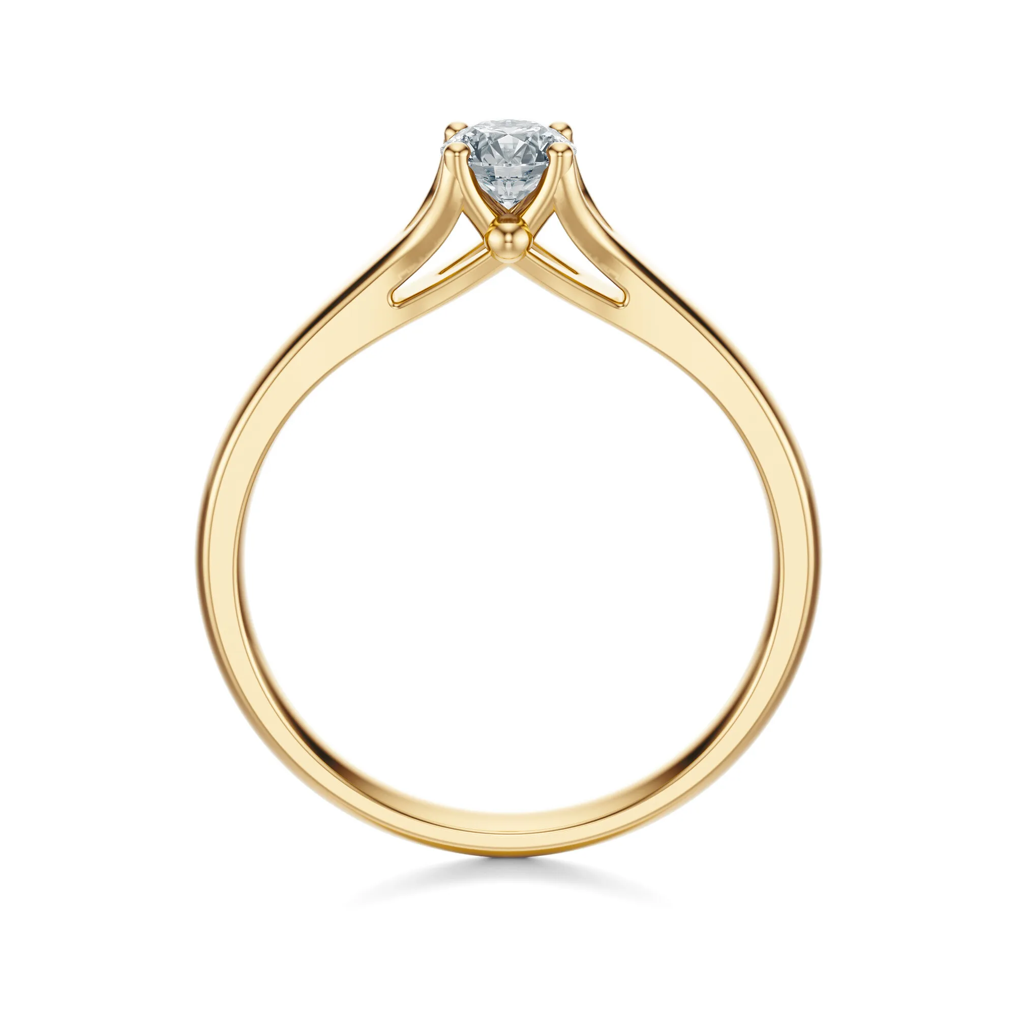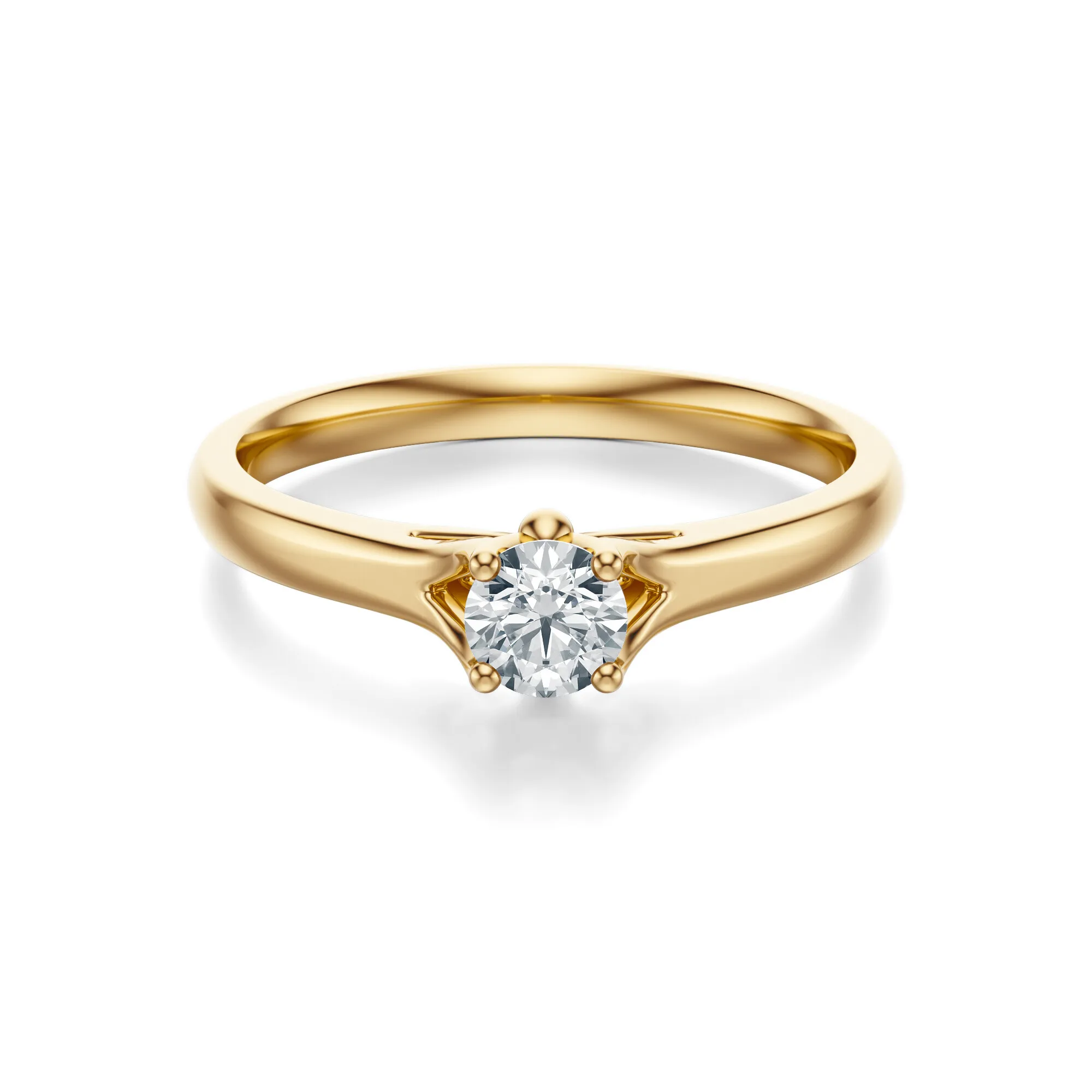 Ten klasyczny pierścionek zaręczynowy z żółtego złota o próbie 585 zachwyca ponadczasową elegancją i subtelnym wdziękiem. Jego wyrafinowana forma podkreślona została przez centralnie osadzony, okrągły diament, który odbija światło z niezwykłą intensywnością, przyciągając wzrok i dodając wyjątkowego blasku całej kompozycji. Gładka powierzchnia obrączki oraz precyzyjne wykończenie sprawiają, że całość prezentuje się harmonijnie i luksusowo.