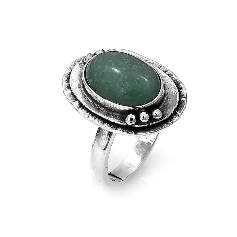 Biżuteria z kamieniem to również specjalność Blue Topaz, na dowód czego przedstawiamy ten pierścionek srebrny z zielonym kamieniem. W tym projekcie wykorzystaliśmy wszystkie dostępne metody, które dodają uroku biżuterii ręcznie robionej. Między innymi jest nim obróbka użytego srebra. Warto zwrócić uwagę na obrączkę. Jej delikatnie nieregularna faktura podkreśla naturalność i niewielki wpływ ręki ludzkiej na ostateczne piękno formy wyrobu. Kolejnym elementem jest sam kamień. Owalna forma kamienia i idealnie gładka powierzchnia w pełni odsłania piękno zielonego kamienia z drobinkami połyskującymi w słońcu. Wokół kamienia osadzonego w wysokiej oprawie jest ramka z różnymi metodami anodowania, wykonana na wzór postarzanego złota. Całość ma oryginalny, nietuzinkowy charakter i przykuwa wzrok.