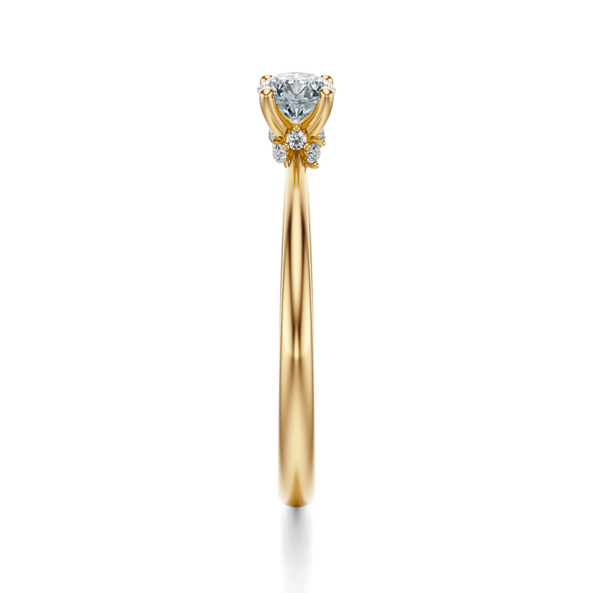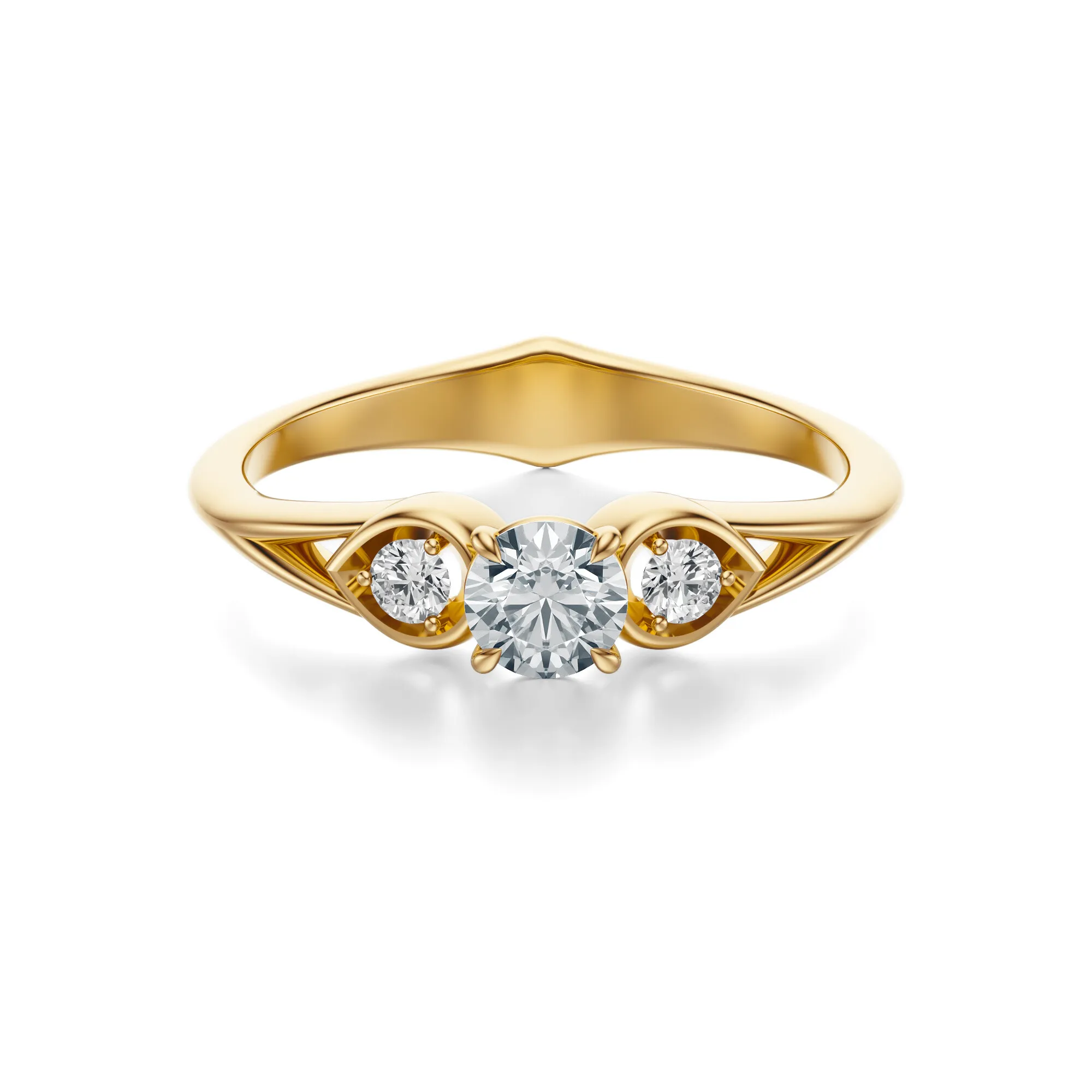 Ten zachwycający pierścionek zaręczynowy wykonany z żółtego złota o próbie 585 emanuje klasyczną elegancją i subtelnym urokiem. Jego głównym punktem jest perfekcyjnie osadzony okrągły diament, który przyciąga spojrzenie intensywnym blaskiem. Delikatne dodatkowe kamienie przy koronie tworzą finezyjną kompozycję, która dodaje całości lekkości i kobiecego wdzięku.