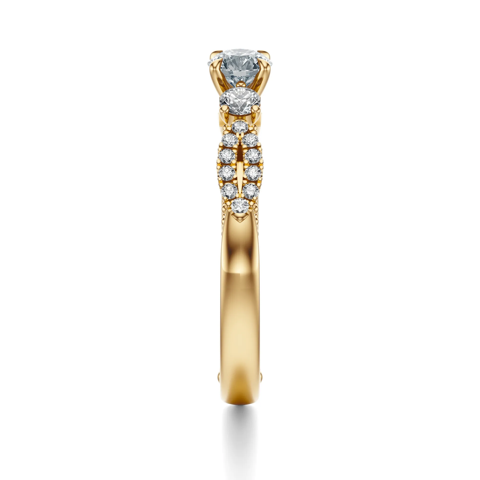 Ten niezwykle efektowny pierścionek zaręczynowy wykonany z żółtego złota o próbie 585 przyciąga spojrzenia już od pierwszego momentu. Zachwyca wyrafinowaną formą i intensywnym blaskiem diamentów, które zostały misternie osadzone na całej powierzchni obrączki. Główne skrzypce gra tu centralny okrągły diament, harmonijnie uzupełniany przez dwa mniejsze kamienie po bokach i liczne, drobne brylanty wkomponowane w delikatne zdobienia.