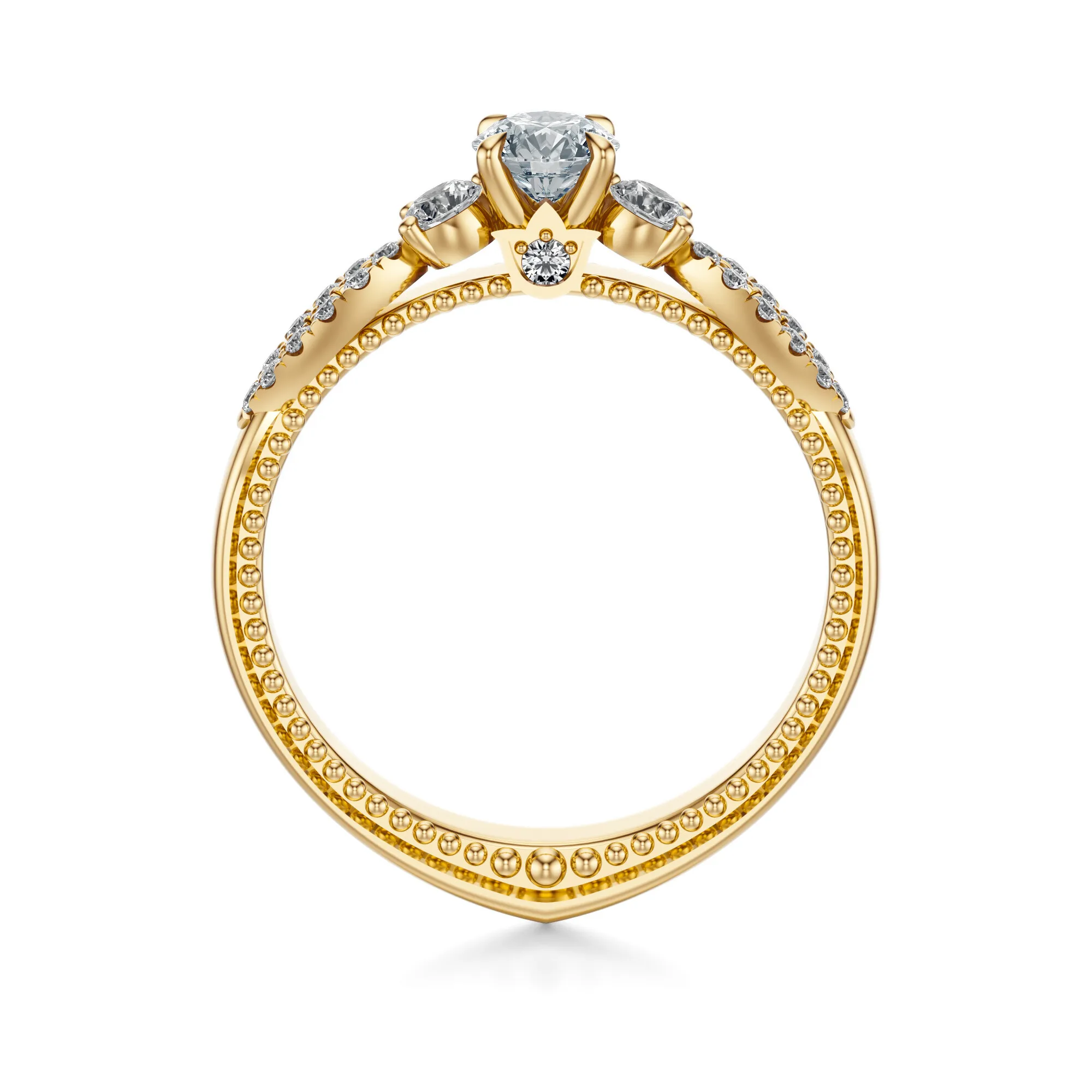 Design pierścionka łączy w sobie klasyczny urok z artystycznym wykończeniem i ornamentalnymi detalami. Obrączka została ozdobiona delikatnymi kuleczkami złota, które tworzą ramę dla oszlifowanych kamieni, nadając biżuterii szlachetności i romantycznego charakteru. To idealna propozycja dla kobiet ceniących oryginalne, ale eleganckie pierścionki. Diamenty symbolizują trwałość, siłę i czystość uczuć — doskonale sprawdzą się jako wyraz głębokiej miłości, nie tylko na zaręczyny, ale także jako prezent jubileuszowy.