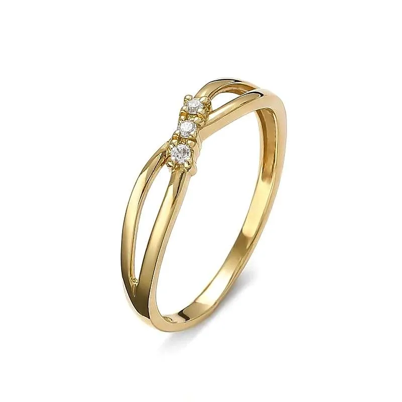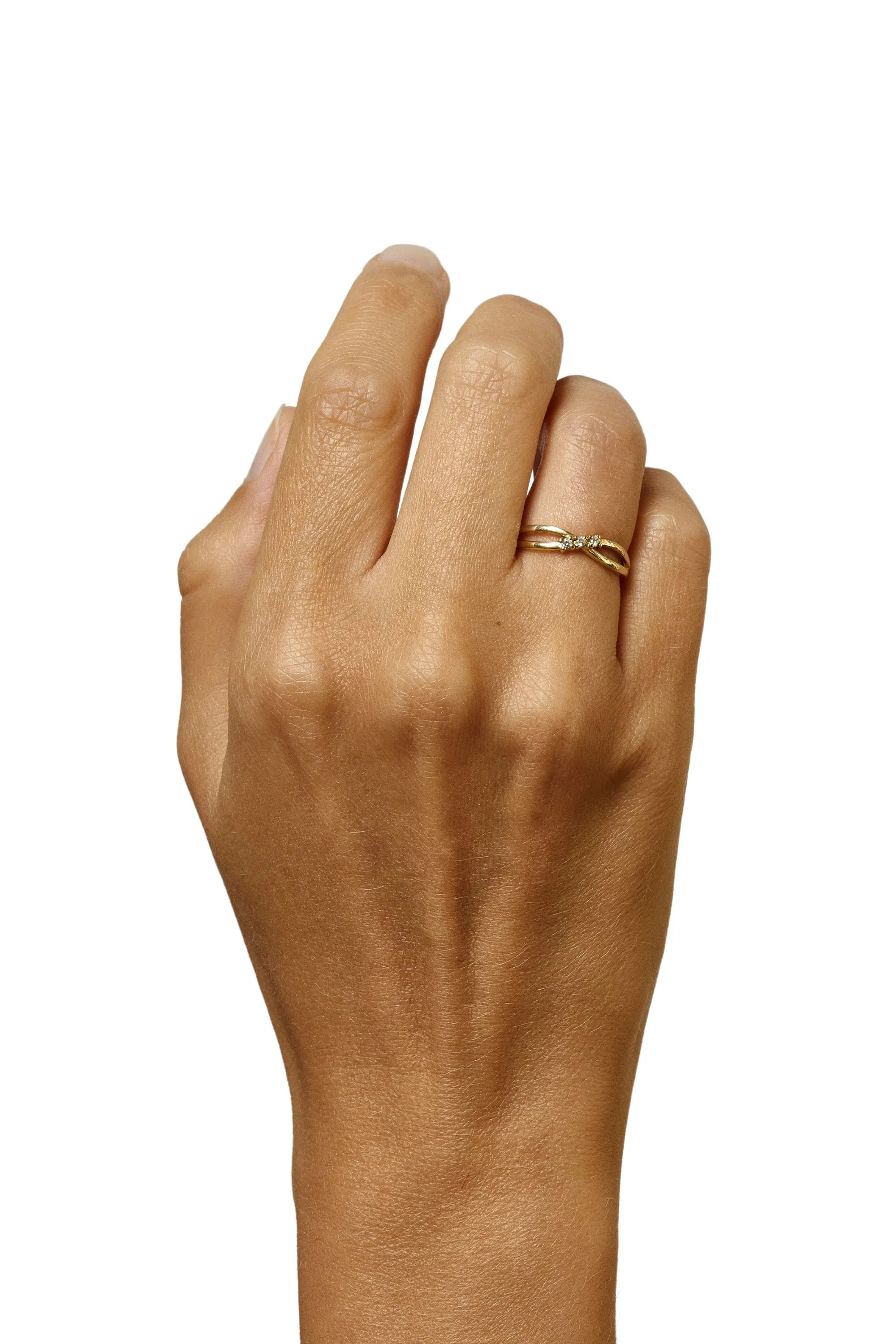 Ostatnie trendy modowe wyraźnie wskazują tendencję do ubierania dużej ilości pierścionków na dłonie. Wtedy doskonale komponują się ze sobą pierścionki o delikatnej formie jak prezentowany tutaj złoty pierścionek z diamentami.Wyjątkowa złoty pierścionek od połowy obwodu rozwidla się, tworząc piękny splot podwójnej obrączki. Jeden ze splotów wysadzany jest niewielkimi diamentami. Doskonała kompozycja delikatnej formy i piękna diamentów tworzy tę niezwykłą obrączkę z diamentami.
