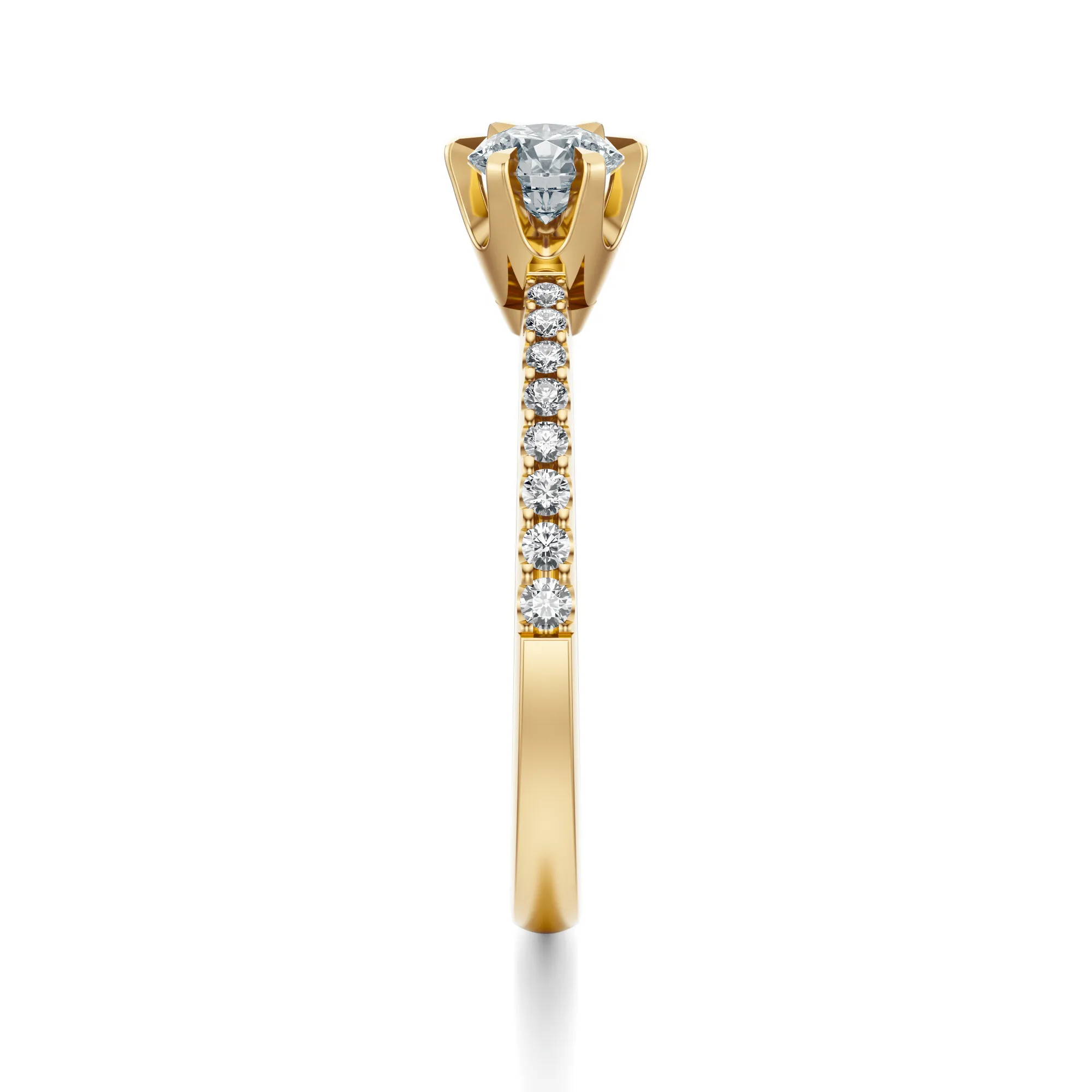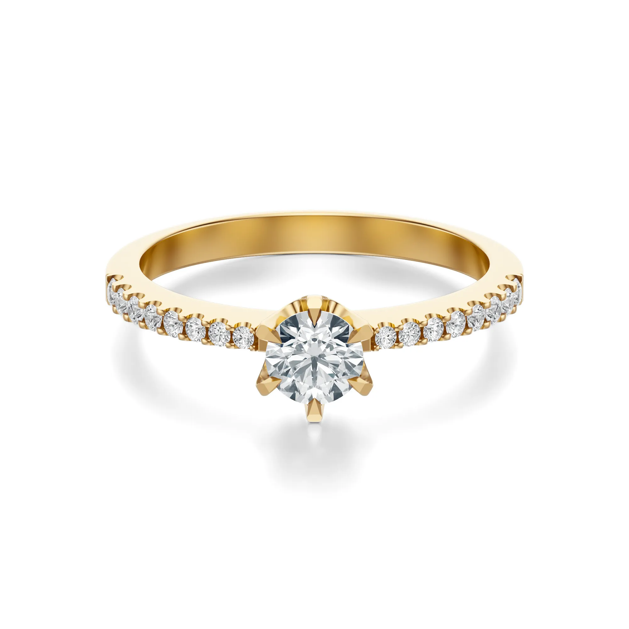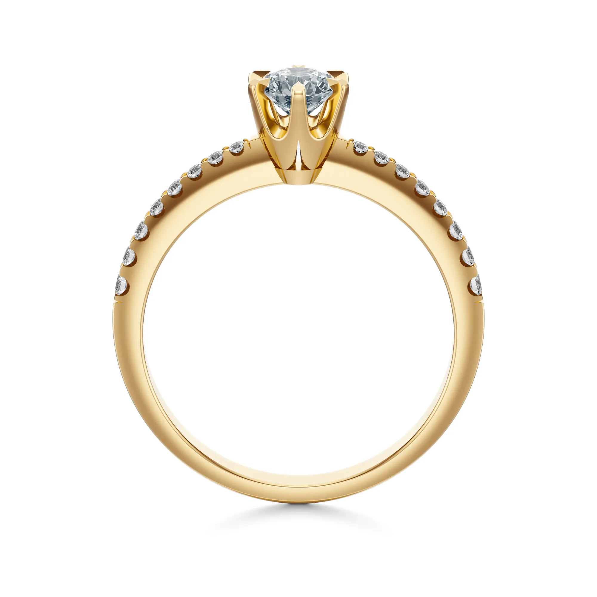 Ten pierścionek zaręczynowy zachwyca wyrafinowaną formą i subtelnym blaskiem, który przyciąga spojrzenia. Wykonany ze złota o próbie 585 w kolorze żółtym, doskonale łączy klasyczną elegancję z nowoczesnym akcentem. Jego najważniejszym punktem jest olśniewający diament osadzony w sześciu łapkach, otoczony szeregiem mniejszych kamieni, które zdobią obrączkę, tworząc efekt migoczącego światła.