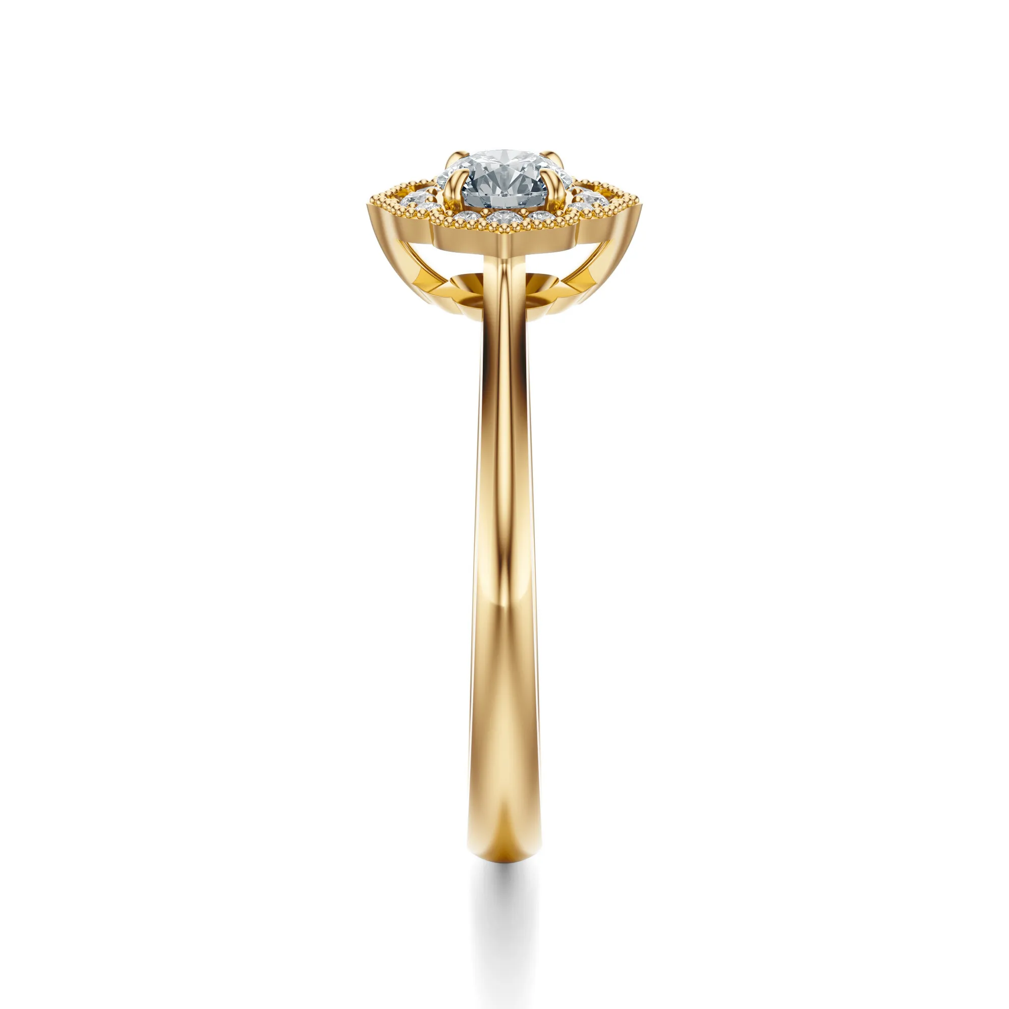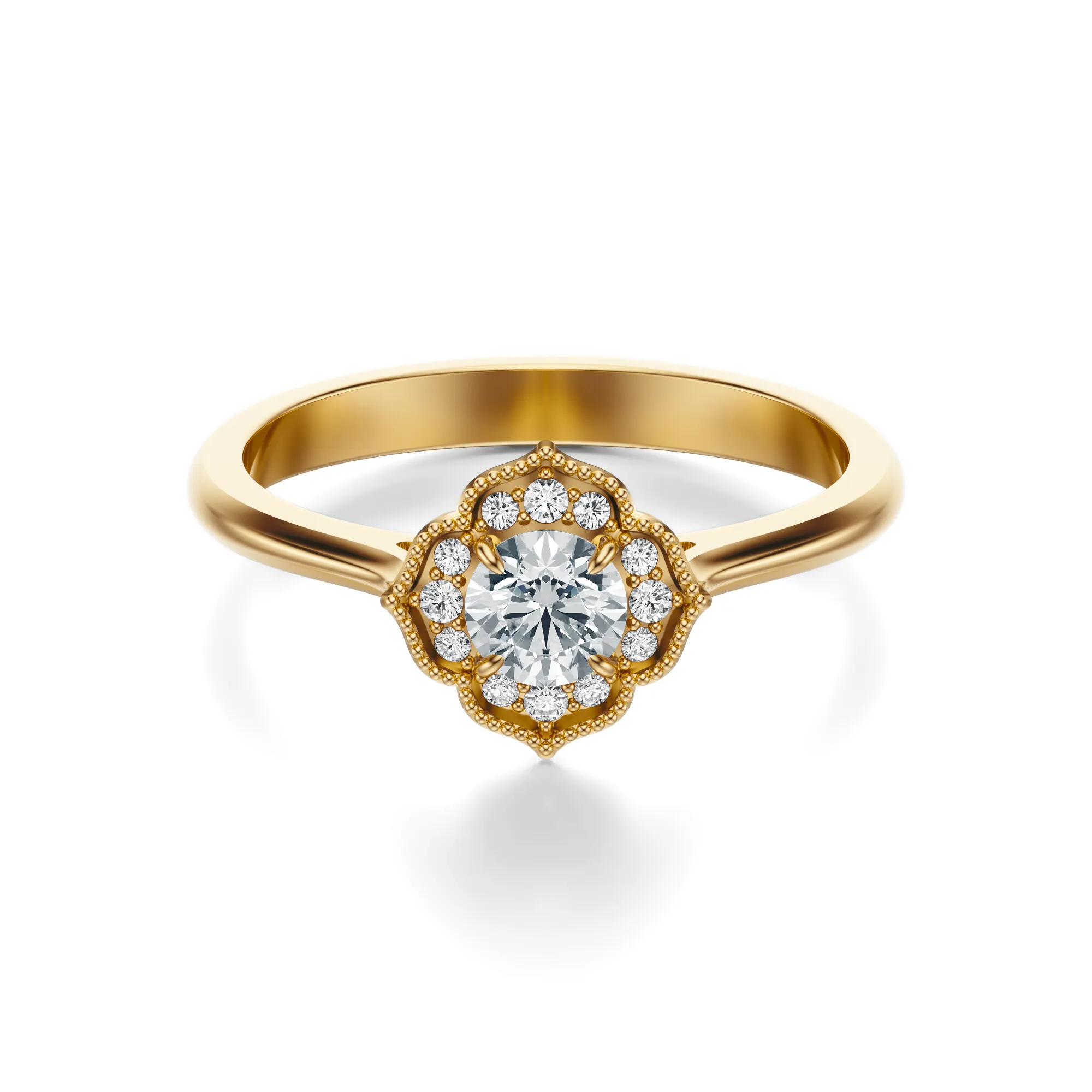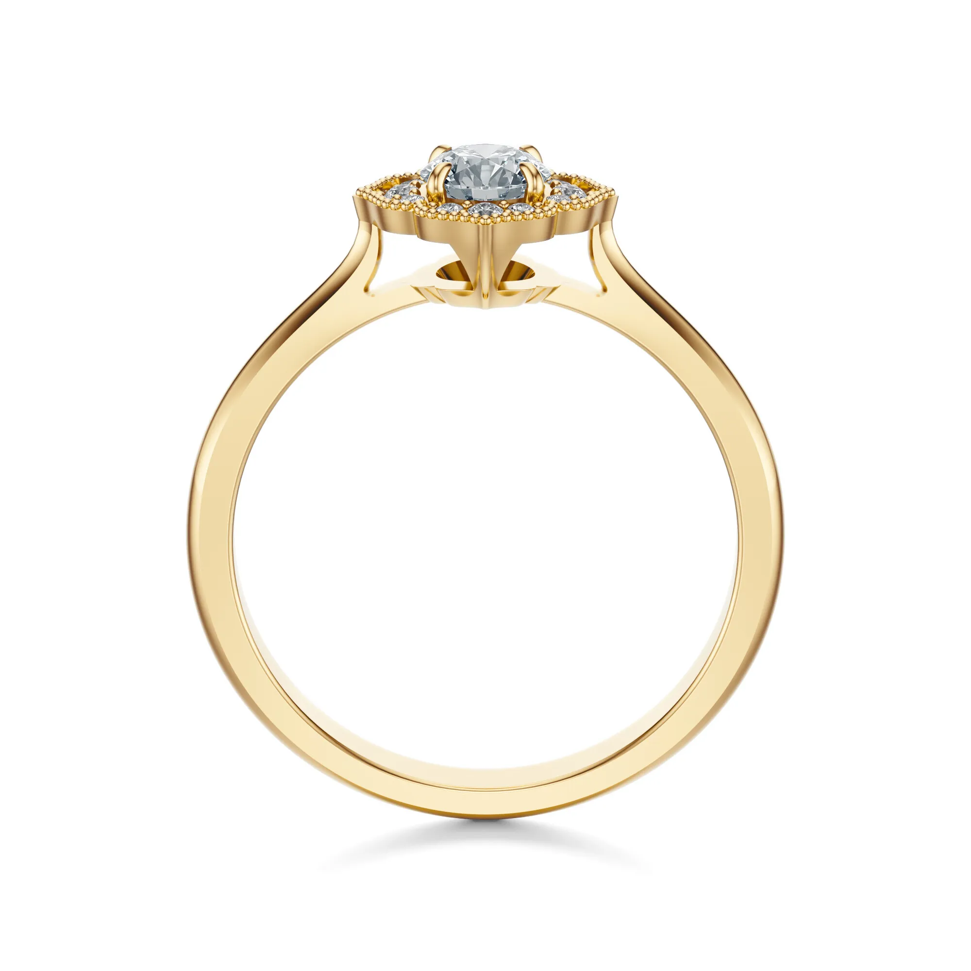 Zachwycający pierścionek zaręczynowy z żółtego złota o próbie 585 to propozycja dla kobiet, które cenią kunszt jubilerski i ponadczasową elegancję. Centralny, okrągły diament otoczony został delikatną aureolą mniejszych kamieni, które subtelnie wpisano w misternie wyprofilowaną oprawę przypominającą płatki kwiatu. Całość prezentuje się wyjątkowo romantycznie, a intensywny blask diamentów nadaje pierścionkowi luksusowego charakteru.