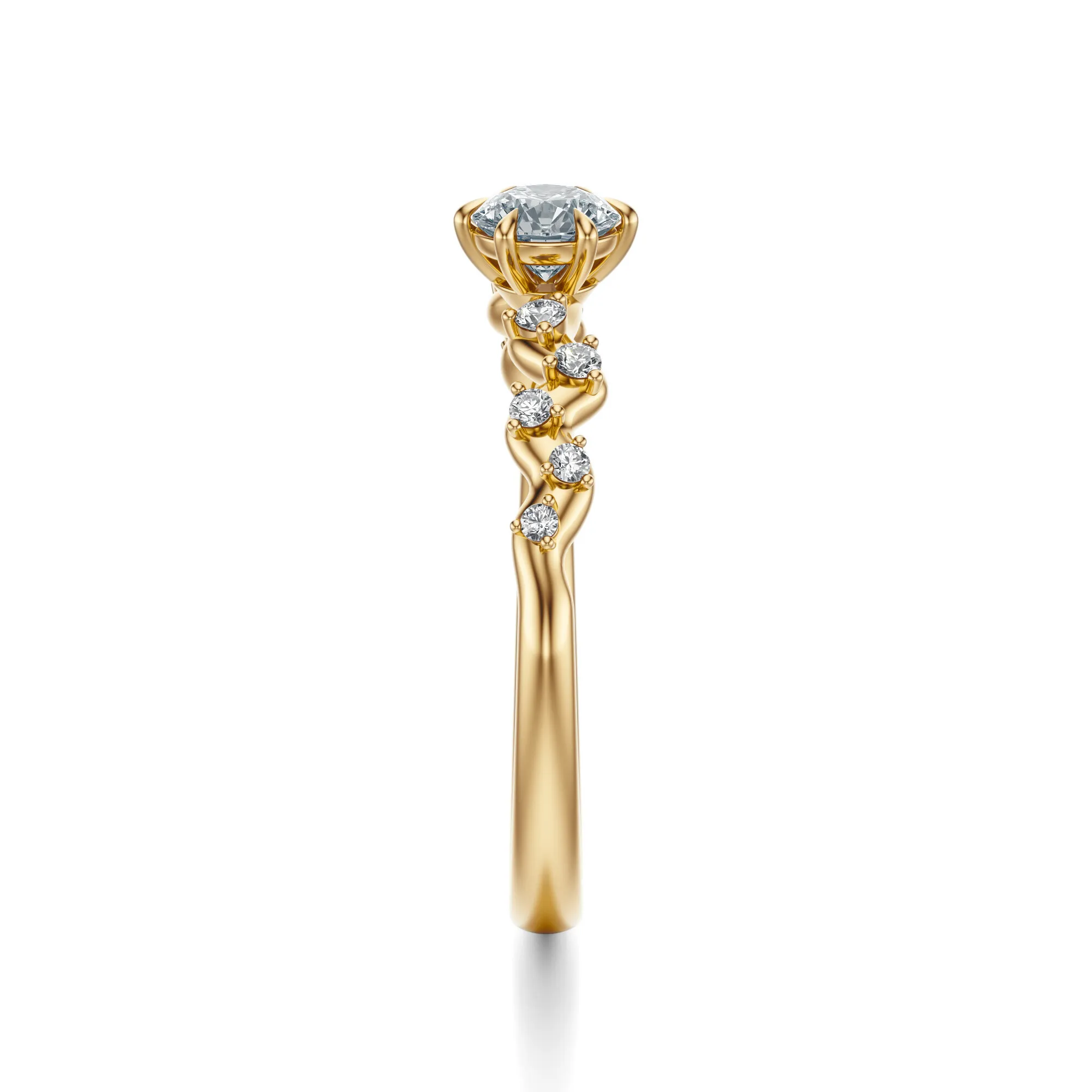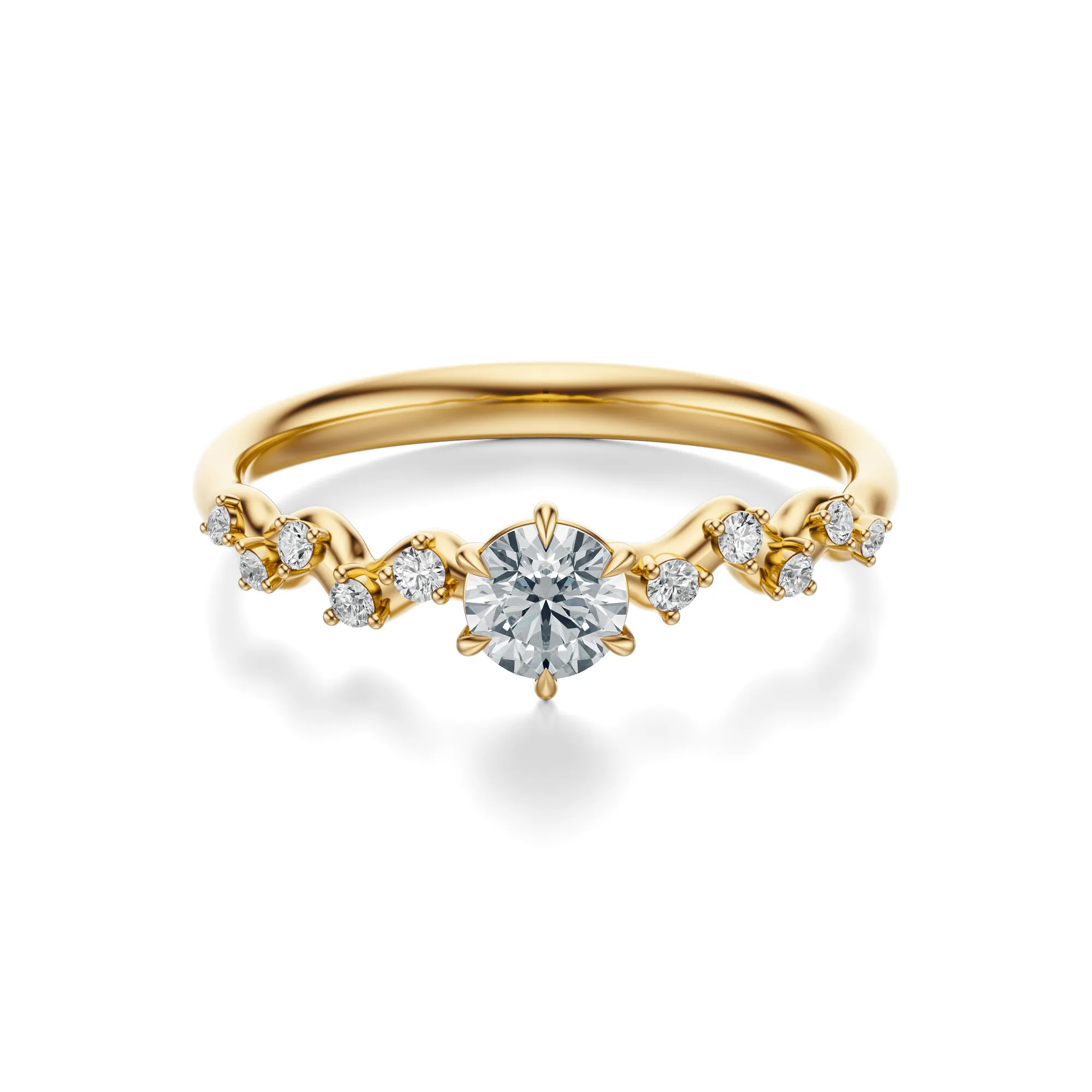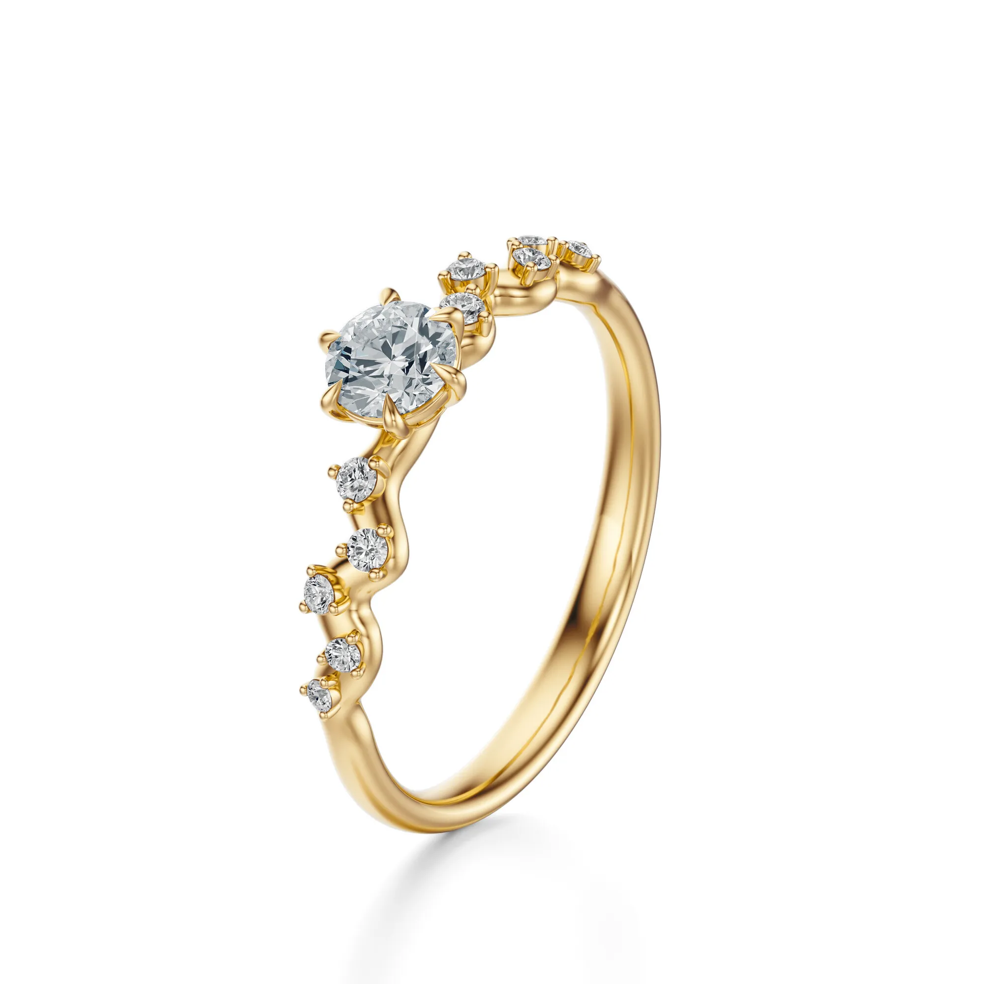 Ten olśniewający pierścionek zaręczynowy wykonany ze złota o próbie 585 w ciepłym odcieniu żółtego złota, zachwyca unikalnym projektem i perfekcyjnie oszlifowanymi diamentami. Jego subtelna linia i falujący układ kamieni wprowadzają delikatny ruch i harmonię, nadając mu lekkość i romantyczny charakter. Centralny, okrągły diament o intensywnym blasku stanowi serce kompozycji, podkreślając wyrafinowany styl całości.