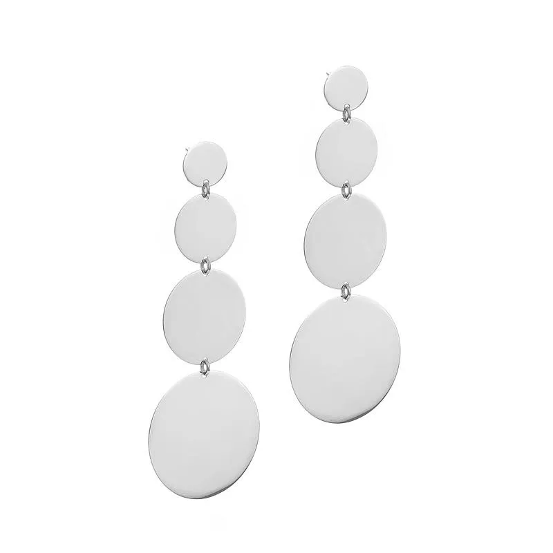Delikatne, wiszące kolczyki na sztyft składające się z trzech wypolerowanych kółek o różnych rozmiarach zostały wykonane ze srebra próby 925. Długie kolczyki to wyrazisty akcent, który doda Twoim stylizacjom nieco seksapilu i świetnie będą prezentować się do imprezowego stroju. Wystarczy dopasować do nich minimalistyczną, połyskującą celebrytkę, a taki komplet biżuterii z pewnością podkreśli Twoją osobowość.