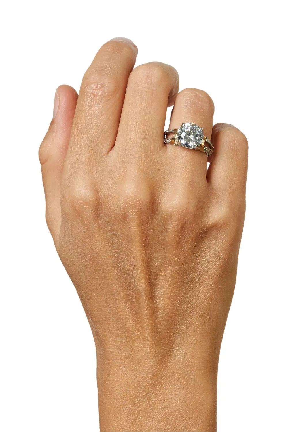Pierwszym elementem, który przyciąga uwagę w tym pierścionku, jest główny kamień centralny. Wykorzystano najwyższej jakości cyrkonię, która ma imitować błysk diamentu. Cyrkonie są popularnym wyborem w jubilerstwie ze względu na swoje podobieństwo do diamentów, a jednocześnie są bardziej przystępne cenowo. Kamień ten został starannie osadzony w pierścieniu za pomocą techniki mikroskopowej, która zapewnia stabilność i trwałość.