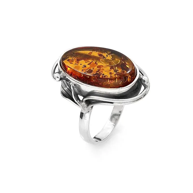 Poznaj klasykę, czyli połączenie bursztynu ze srebrem. W tym projekcie wykorzystano duży, owalny, transparentny bursztyn z naturalnymi drobinkami i strukturą, akcentująca naturalne piękno kamienia. Ten duży srebrny pierścionek z kamieniem to wyjątkowy dodatek, który dodaje elegancji i wyrafinowania każdej stylizacji. Klasyczny design oraz efektowny kamień sprawiają, że pierścionek staje się niepowtarzalnym elementem garderoby. Jest to biżuteria, która przyciąga spojrzenia swoim niezwykłym urokiem i stylem.
