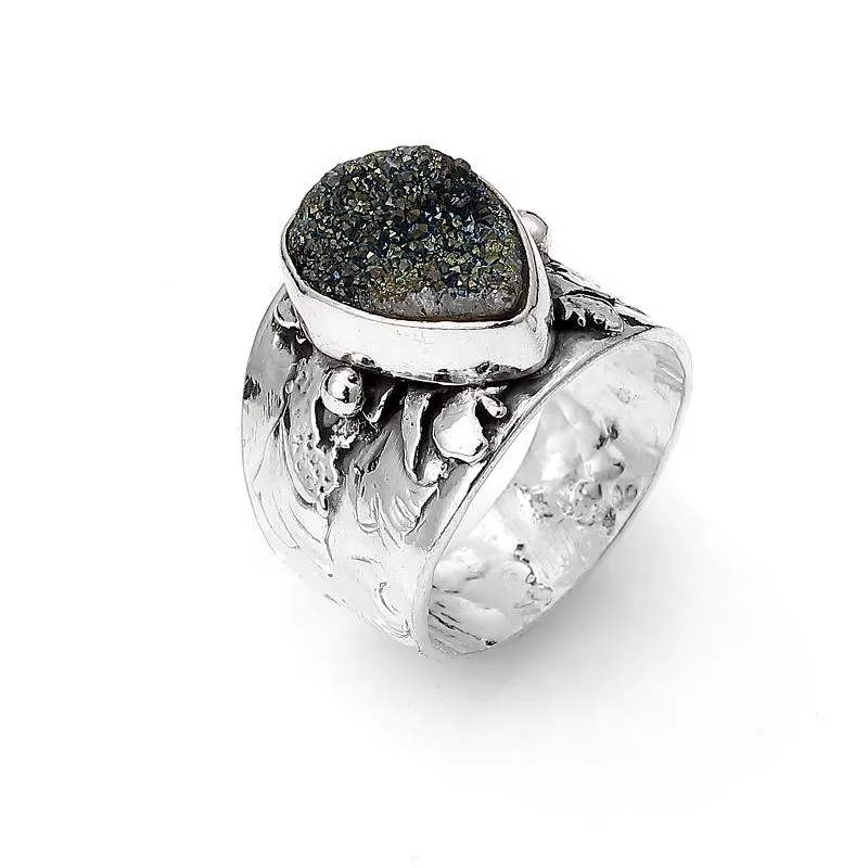 Pierścionek z czarnym kamieniem mieniącym się w odcieniach tęczy prezentuje się na dłoni niezwykle oryginalnie. Również wielkość i kształt minerału w oprawie w kształcie łezki jest powodem interesującego projektu całości tego pierścionka. Aby jeszcze bardziej podkreślić artystyczny charakter, ten pierścionek z kamieniem naturalnym posiada obrączkę z postarzanego srebra. Oznacza to, że obrączka ma nierówną powierzchnię, a faktura produktu jest miejscami anodowana w kolorze czerni, tworząc efekt postarzanego metalu.