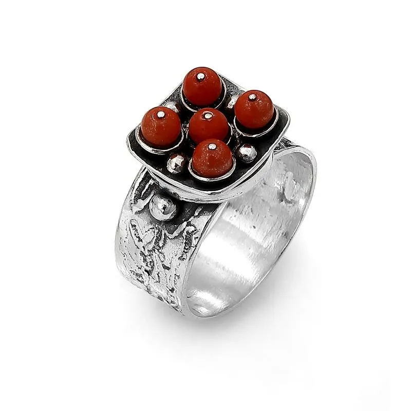 Czerwień koralu subtelnie podkreślona przez grubą, srebrną obrączkę i precyzyjnie opracowane detale, pozwoliła stworzyć pierścionek z koralem naturalnym całkowicie inny od większości proponowanych w sklepach. Charakterystycznymi elementami pierścionka jest obrączka i korona pierścionka z kamieniem. Szeroka obrączka z ciekawą, nieregularną fakturą podkreśla piękno i oryginalność ręcznego wyrobu. Centralną ozdobą pierścionka jest postarzana, srebrna misa, w której osadzono pięć koralowych kuleczek o idealnym kulistym kształcie. Zestawienie artystycznie postarzanego srebra z pięknem koralowych dodatków sprawia, że ten pierścionek z koralem dedykowany jest kobietom, które lubią się wyróżniać i chciałyby wzbogacić swoje dodatki o kolejny, wyjątkowy element.