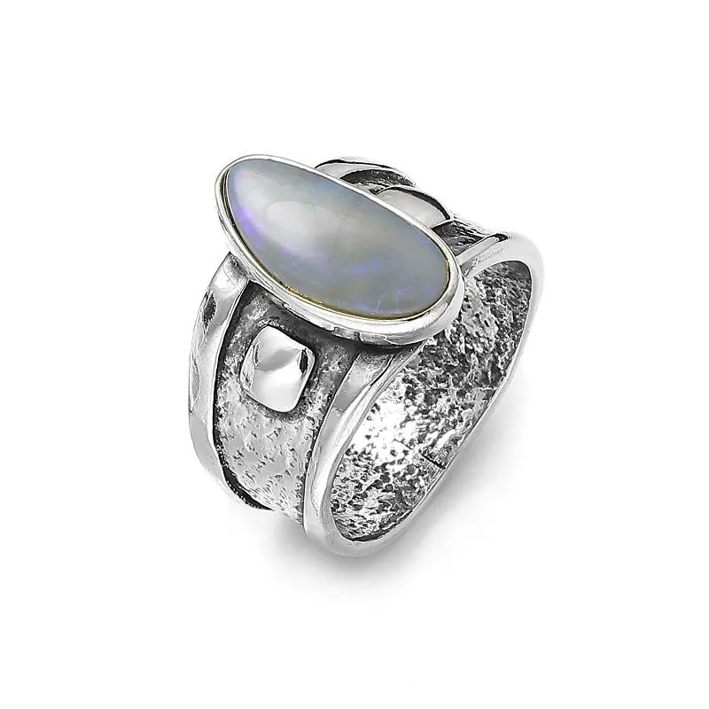 W tym miejscu prezentujemy pierścionek srebrny z kamieniem o bardzo ciekawej obrączce. Szeroka obrączka wykonana jest ze srebra z efektem postarzenia. To bardzo modny i popularny efekt w biżuterii artystycznej. Zestawienie elementów gładkich wraz z szorstką strukturą centralnej części obrączki pozwala odbijać w różny sposób światło, co daje ciekawy efekt. Masywną obrączkę, która już sama w sobie stanowi piękny dodatek zdobi opal o nieregularnym kształcie w dopasowanej, srebrnej oprawie. Naturalny opal mieni się na różne kolory w zależności od rodzaju i kąta padania światła. Przypomina masę perłową, a jego ciemny odcień idealnie komponuje się z jasnym srebrem na zasadzie kontrastu.