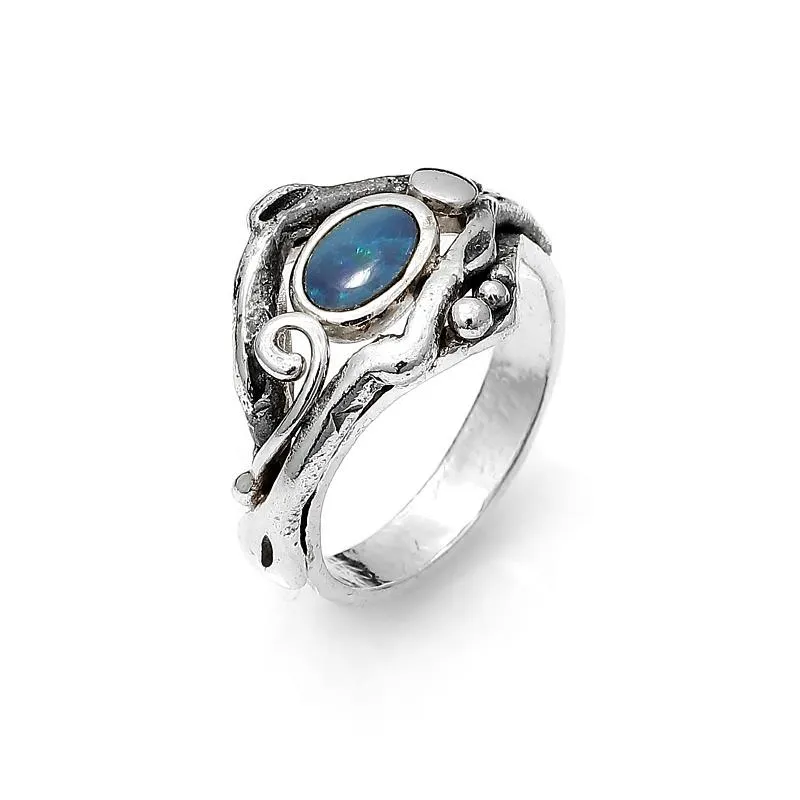 Ten pierścionek to srebrny pierścionek z opalem. Opal to niezwykle piękny kamień naturalny. Każdy różni się od siebie barwą, strukturą i wzorem. Całe piękno opalu polega na jego reakcji na światło i to, że w zależności od formy zaprezentowania kamienia można uzyskać zupełnie inny efekt. Jeśli pierścionek z kamieniem szlachetnym to coś, czego szukałaś, a dodatkowo lubisz wyroby ze srebra – trafiłaś doskonale. Niezwykle ciekawa forma obrączki pełna artystycznego piękna, a w jej centrum opal o niebieskim kolorze z drobinkami mieniącymi się na kolor szmaragdowy.