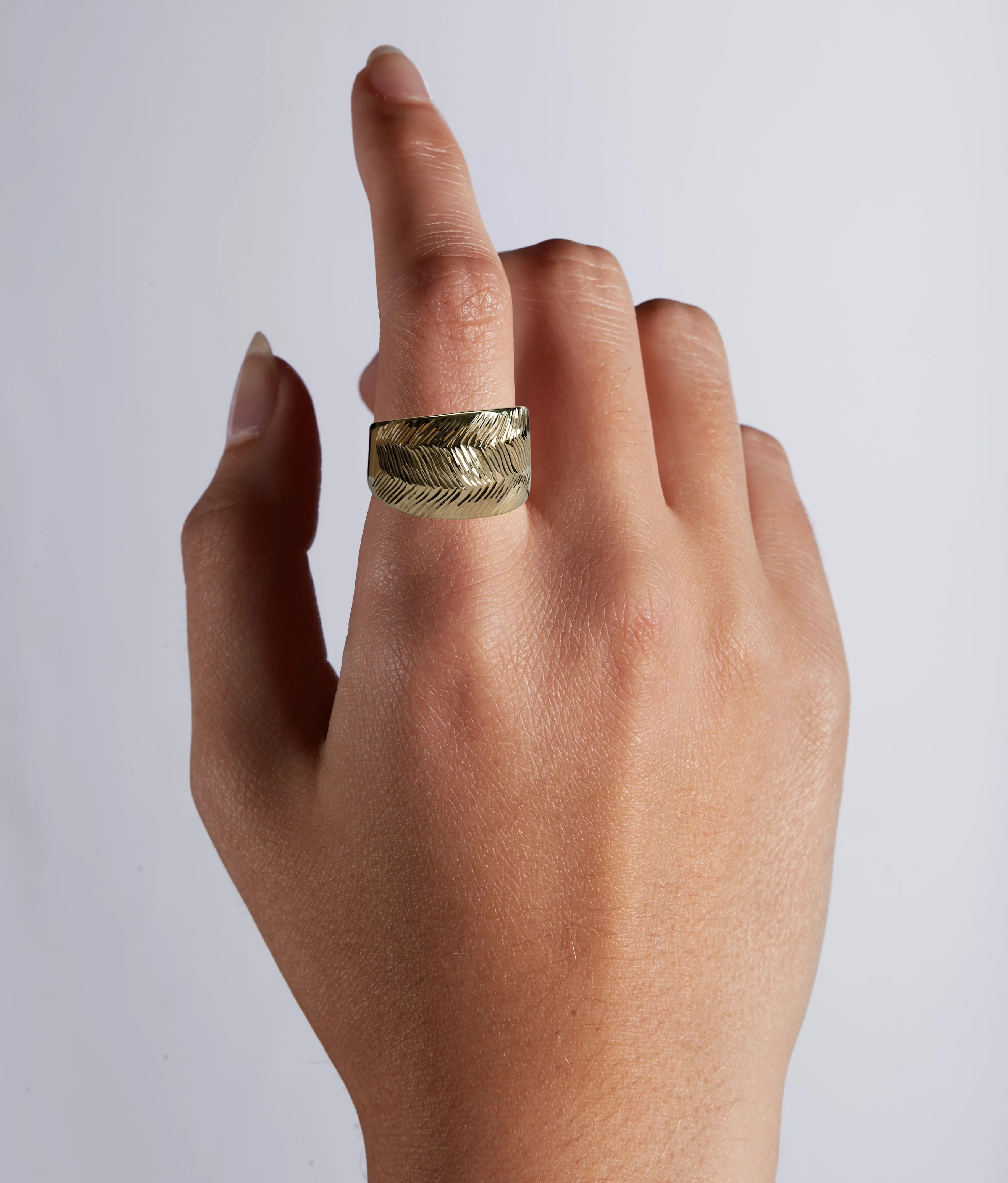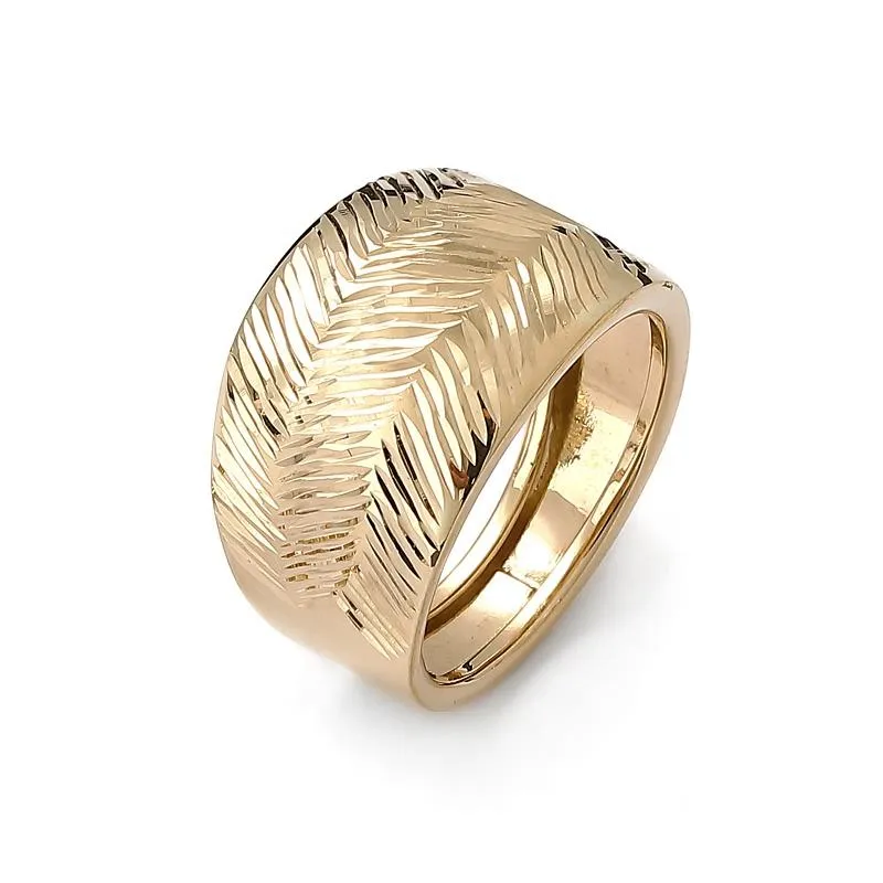 Nowoczesne pierścionki złote wybierane są przez kobiety szukające w biżuterii minimalizmu i wygody, a także niebanalnego stylu. Wszystkie te cechy posiada ten szeroki złoty pierścionek o niezwykle ciekawym szlifie w jodełkę. Taka struktura doskonale odbija światło, sprawiając, że biżuteria nie umknie oczom towarzyszy. Dzięki temu, że cały pierścionek wykonany jest ze złota, pasuje do różnych złotych dodatków, nawet tych z kamieniami lub łączących białe złoto z żółtym. Wygodny, ergonomiczny kształt pozwala nosić tak szeroki złoty pierścionek bez obaw o dyskomfort.