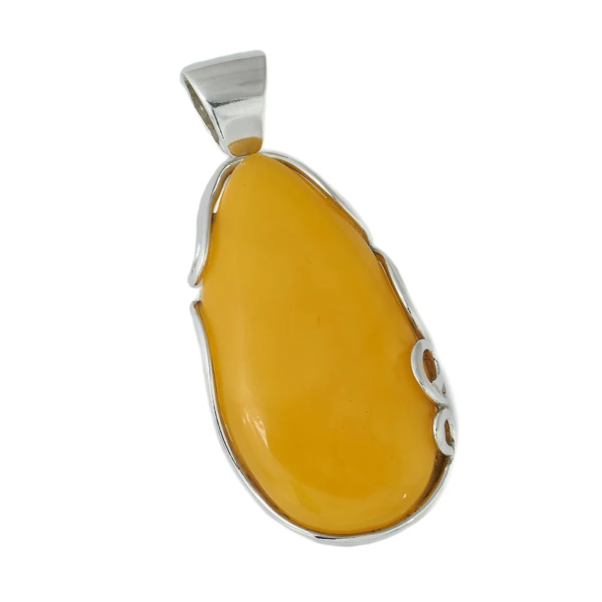 Przedstawiamy unikatowy wisior z bursztynu w srebrnej oprawie, wykonany ręcznie z wyselekcjonowanego, prawdziwego bursztynu bałtyckiego. Piękno togo bursztynu tkwi w jego wyjątkowej kolorystyce. Bursztyn o niskim stopniu przezroczystości w kolorze żółtym przykuwa wzrok oryginalnością odmiany kolorystycznej oraz pięknym kształtem, jaki został mu nadany. Dodatkowo srebrna oprawa z dodatkowymi zdobieniami dodaje całości charakteru i wyjątkowego designu.