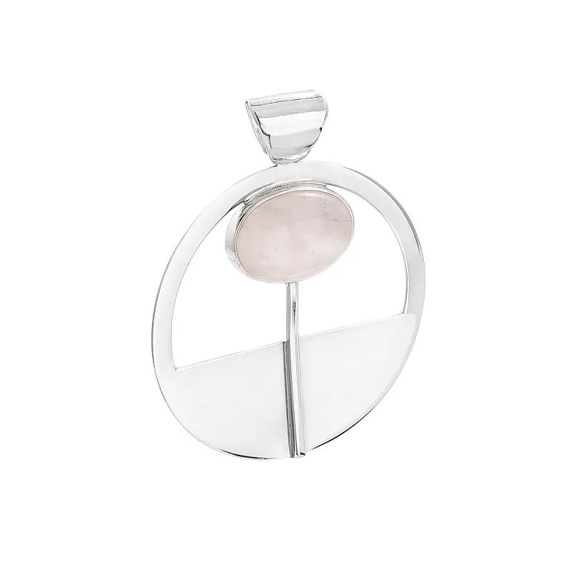 W centralnym punkcie wisiorka umieszczony jest piękny, różowy kamień naturalny, który emanuje delikatnym blaskiem i dodaje subtelności całości. Kamień ten jest starannie osadzony w srebrnym okręgu, który otacza go jak ramka, podkreślając jego piękno i unikalność.