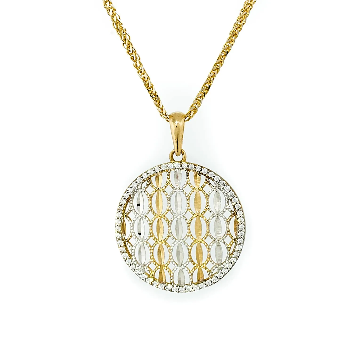 Złoty wisiorek w dwukolorowym wzorze będzie świetnym prezentem dla miłośniczki subtelnej biżuterii. Stylowy dodatek to połączenie klasy i elegancji. Dwukolorowe złoto delikatnie połyskuje, dzięki wykonaniu z najwyższą starannością i dbałością o każdy szczegół. Dodatek można nosić na co dzień, ale także do wieczorowych kreacji, a podarowany w dniu urodzin czy imienin stanowi wspaniały akt wdzięczności.