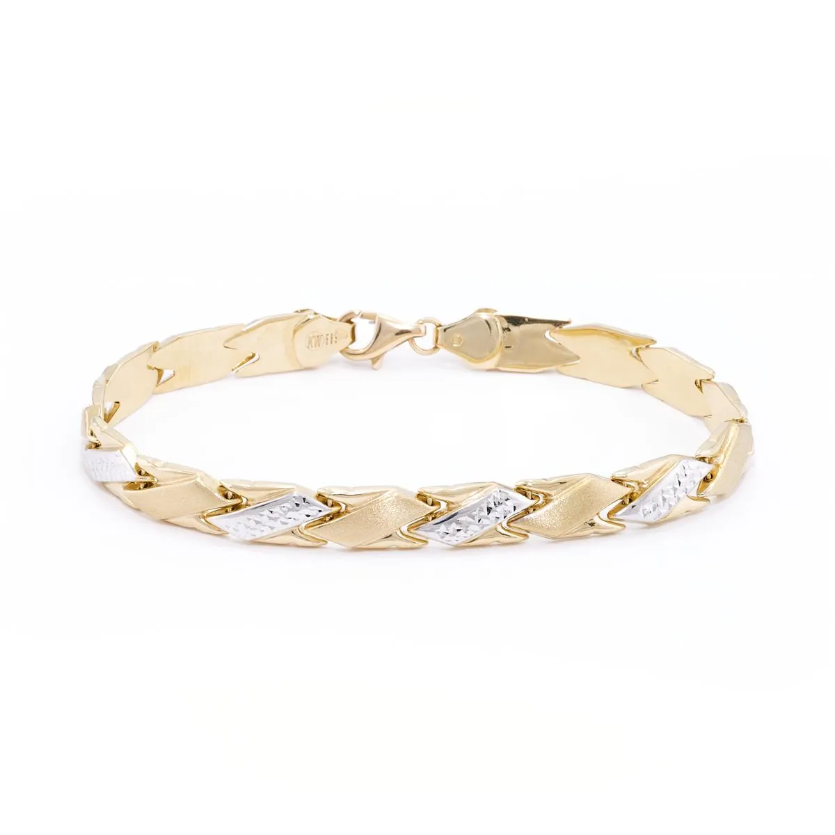 W tej bransoletce chłodna elegancja białego złota przeplata się z gorącym blaskiem żółtego złota. Damska biżuteria modułowa została wykonana ze złota wysokiej próby 585. Ze względu na swoją formę świetnie sprawdzi się jako dodatek do stylizacji w pracy lub na elegancki obiad. Złota bransoletka z dwukolorowych elementów podkreśli urodę każdej właścicielki w niebanalny i intrygujący sposób. Jeśli cenisz sobie luksus i doskonałość to ta biżuteria została wykonana właśnie dla Ciebie.