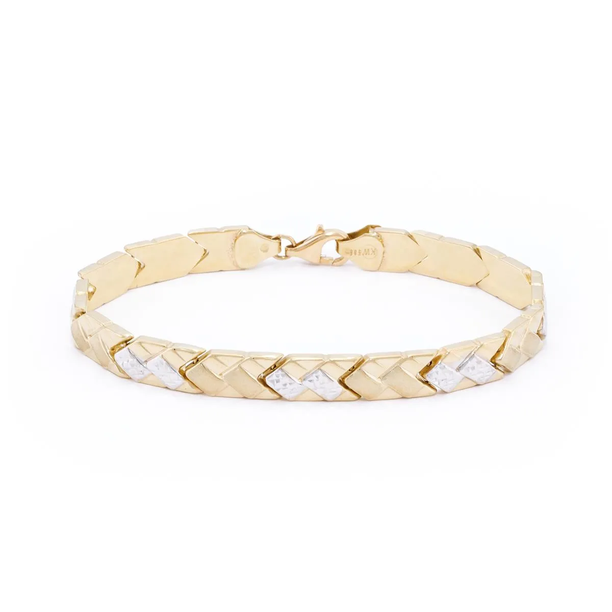 Ozdobna złota bransoletka próby 585 z płaskich, prostokątnych elementów wyróżnia się olśniewającym blaskiem, gładkością i wysoką trwałością. Biżuteria podkreśli kobiece piękno, urokliwie błyszcząc na nadgarstku i doskonale uzupełni codzienną stylizację. Niebanalność tej bransoletki to także zasługa kontrastowego połączenia elementów z żółtego i białego złota. Będzie świetną propozycją dla pań ceniących charakterystyczne ozdoby.