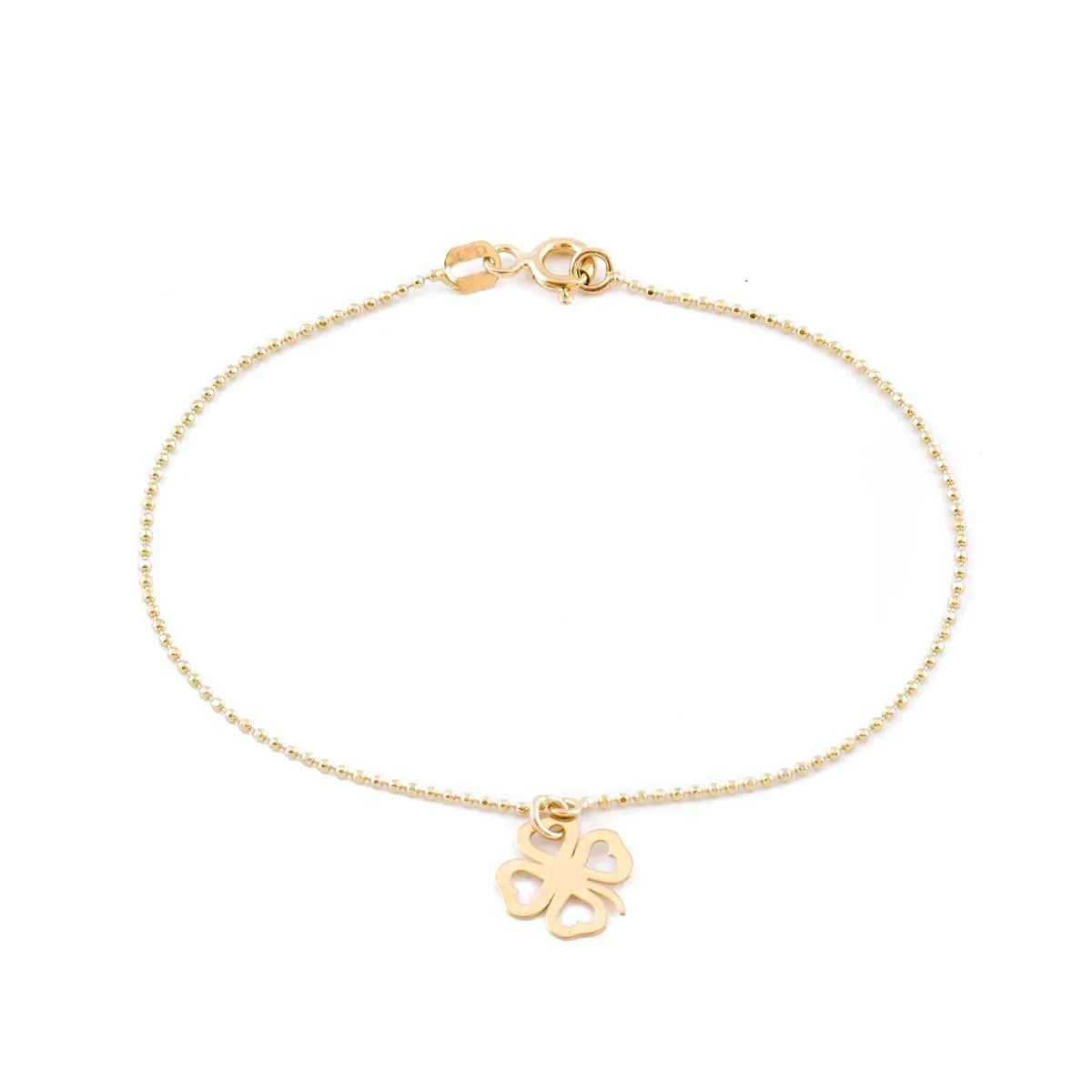 Delikatna, a zarazem stylowa bransoletka czterolistna koniczynka. Ta bransoletka, będzie idealnym dodatkiem do twojego codziennego ubioru. Wykonanie z najwyższej jakości złota z dbałością o każdy detal to gwarancja jakości. Natomiast połączenie malutkich kuleczek jak i elementu ozdobnego tworzy delikatną kompozycję. Jeśli chcesz podkreślić swój styl, bransoletka czterolistna koniczynka to idealny wybór dla ciebie.