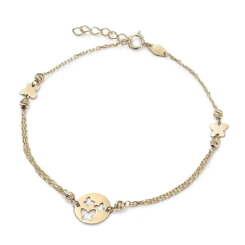 Motyle to typowo kobiecy i dziewczęcy motyw. Teraz możesz uwiecznić te piękne owady na oryginalnej bransoletce od Blue Topaz. Wykonane ze złota czarują równie skutecznie, jak ich naturalne odpowiedniki. Delikatne motylki wycięte z koła w głównej zawieszce oraz motyle po bokach tworzą wyjątkowo ciekawą kompozycję. Ta złota bransoletka motyle łączy piękno subtelnego motywu z klasycznym urokiem złotej bransoletki. Dodatek w postaci grawerowanych kuleczek, dodatkowo akcentuje kunsztowne wykonane zawieszek. Złota bransoletka motyle to doskonały pomysł na prezent dla kobiety w każdym wieku.- Masa: 1,42-1,47 g