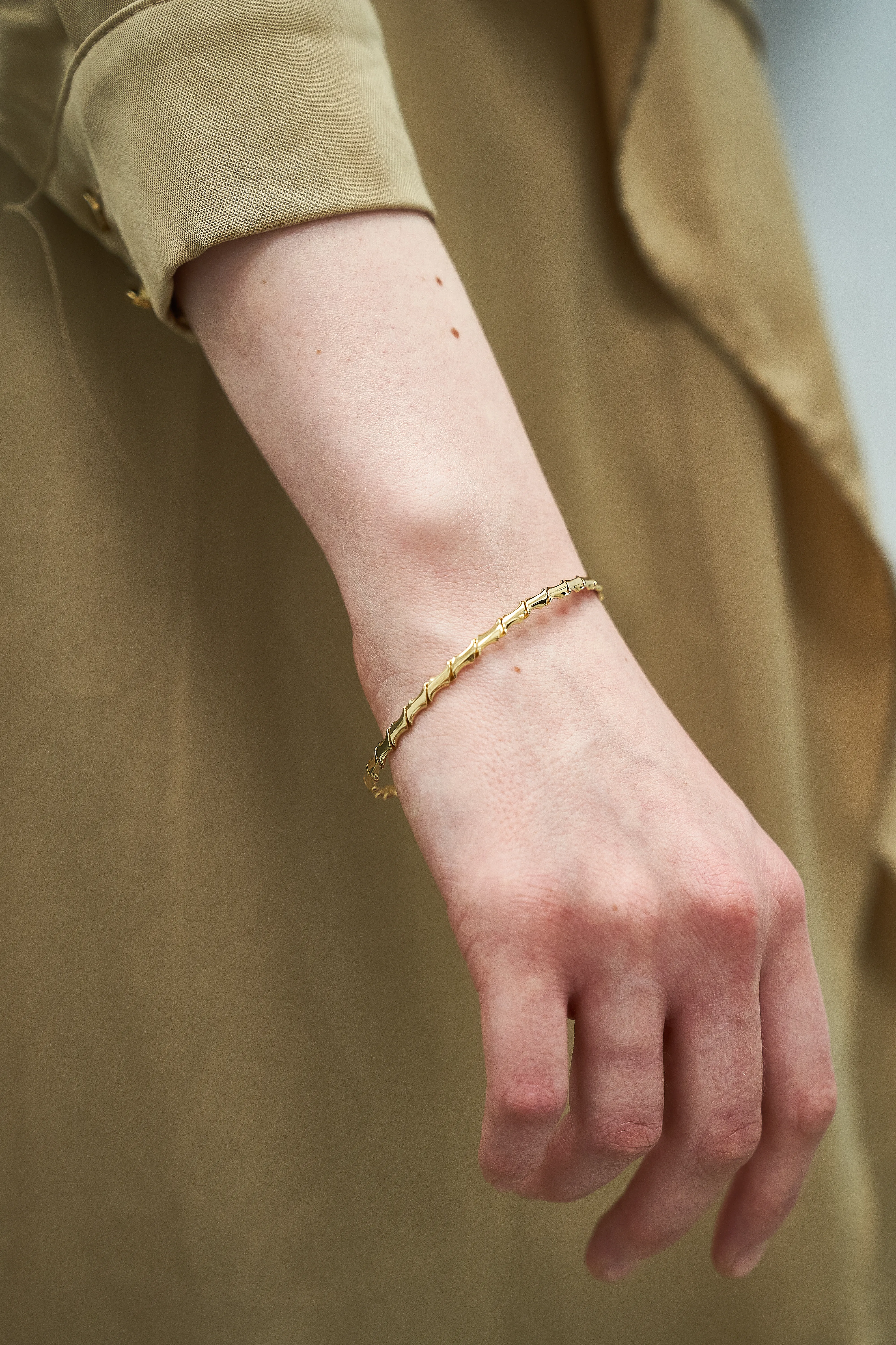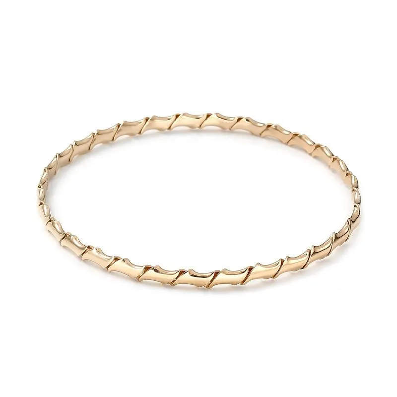 Złota bransoletka sztywne koło to jeden z tych modeli, które rzucają się w oczy i doskonale prezentują nie tylko na ciele, ale również na wąskim, przylegającym rękawie. Dzięki temu, że bransoletka jest sztywna, nie chowa się pod ubraniem, widocznie zdobiąc stylizację.
