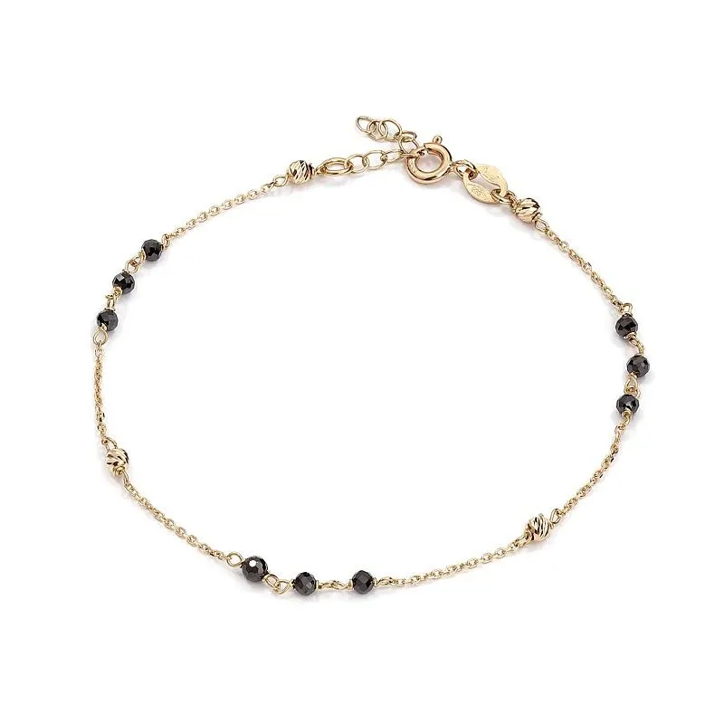 Przedstawiona na minimalistycznym zdjęciu bransoletka złota z kuleczkami wyróżnia się klasycznym, ale zarazem nowoczesnym designem dzięki połączeniu żółtego złota z czarnymi kamieniami. Każdy z kamieni został starannie oszlifowany, co nadaje im eleganckiego blasku i kontrastuje z ciepłym odcieniem złota. Dzięki takiemu zestawieniu kolorów, bransoletka przyciąga wzrok i dodaje charakteru każdej stylizacji. Regulowane zapięcie pozwala na łatwe dopasowanie długości, co czyni ją praktycznym i uniwersalnym dodatkiem. Detale w postaci drobnych, złotych elementów umieszczonych w regularnych odstępach między kamieniami dodają jej lekkości i finezji. Zapięcie karabińczyk zapewnia bezpieczeństwo noszenia, jednocześnie współgrając estetycznie z całym designem. Ta bransoletka jest idealnym wyborem dla kobiet, które cenią sobie elegancję z nutą nowoczesności. Może być noszona solo lub w zestawieniu z innymi bransoletkami, tworząc spójną kompozycję. Subtelny połysk czarnych kamieni w połączeniu z delikatnym łańcuszkiem z żółtego złota tworzy wyjątkowy efekt. To ponadczasowy element biżuterii, który podkreśli szyk i elegancję każdej stylizacji.