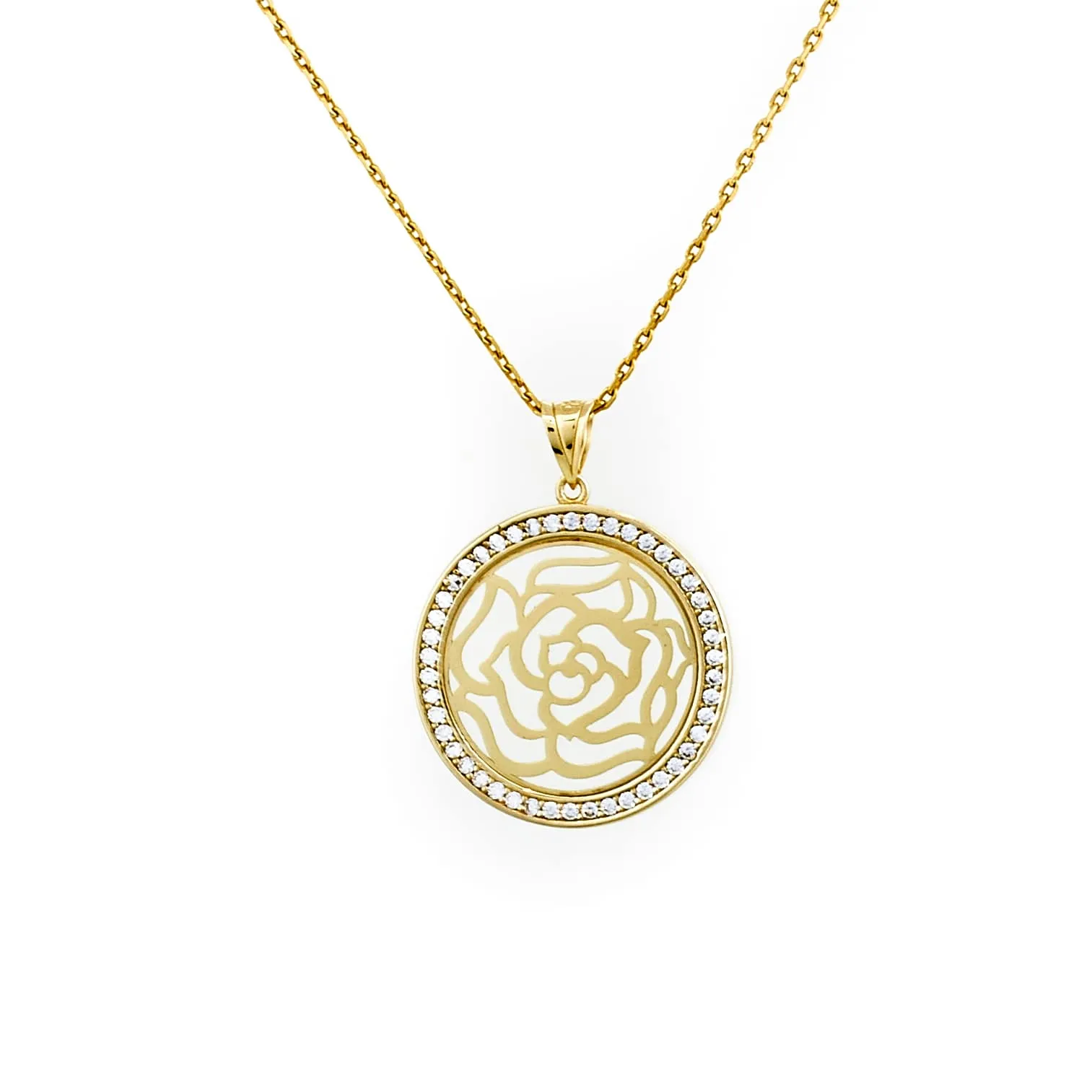 Moda na okrągłe zawieszki intensywnie się rozwija. Zarówno te w stylu glamour jak i boho. Prezentujemy jeden z kilku dostępnych modeli. Ta okrągła złota zawieszka róża jest ciekawym i bardzo kobiecym wzorem. Dodatkowego blasku zyskuje dzięki subtelnej oprawie wokół kwiatu róży, wykonanej z cyrkonii. Połączenie żółtego złota z cyrkoniami sprawia, że okrągła złota zawieszka ażurowa będzie wyglądała elegancko zarówno na złotym, jak i srebrnym łańcuszku dowolnej długości. Uniwersalny motyw pasuje do wielu stylizacji i okazji.