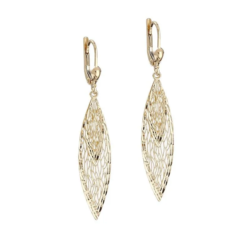 Kolczyki wiszące złote listki ażurowe są najbardziej klasycznym wariantem i mogą pasować zarówno do podniosłych okazji, jak i codziennego stroju. Ocieplą Twoją karnację, a ich dyskretny blask świetnie będzie komponować się z kobiecą urodą. Postaw na złote, wiszące, ażurowe kolczyki, które poruszają się wraz z noszącą je właścicielką. Ażurowy wzór idealnie skomponuje się ze strojem kobiety ceniącej elegancję i wygodę.