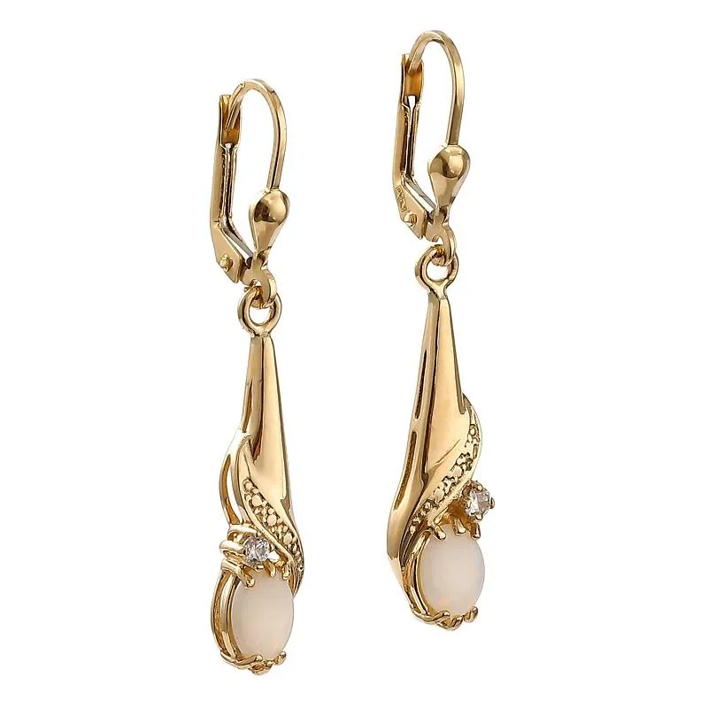Kolczyki z opalem naturalnym to propozycja dla dojrzałych pań ceniących jakość i klasykę. Wykonane ze złota próby 585, przyozdobione zostały naturalnymi crystal opalami, jak i błyszczącymi cyrkoniami. Masywny i efektowny element ozdobny dzięki swobodnemu zawieszeniu na zapięciu cudownie będzie migotał podczas ruchu głowy w świetle. Kolczyki z opalem naturalnym dodadzą blasku Twojej twarzy i podkreślą jej urok.