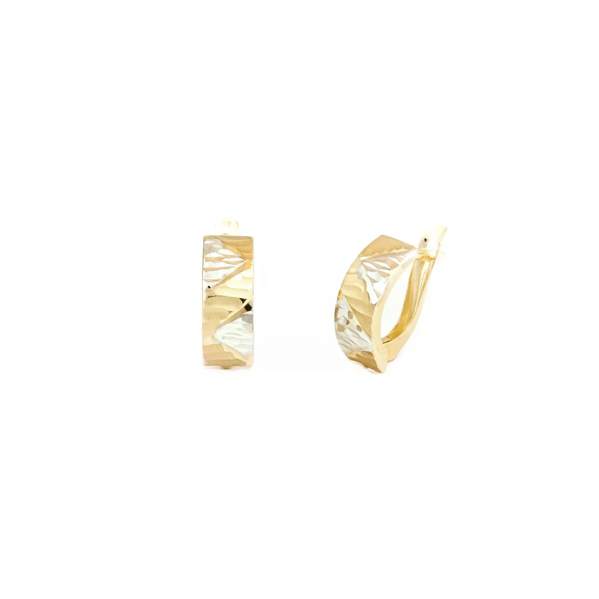 Bogato zdobione złote kolczyki z angielskim zapięciem są efektownie wykończone w białym i żółtym kolorze. Biżuteria stworzona z najwyższej jakości 14-karatowego złota charakteryzuje się precyzją i dokładnością wykonania. Złote kolczyki zauroczą każdą kobietę i będą niezapomnianym podarunkiem. Wygodne angielskie zapięcie jest gwarancją komfortu podczas użytkowania. Wzór stanowi idealny dodatek do dziennych i wieczorowych strojów.