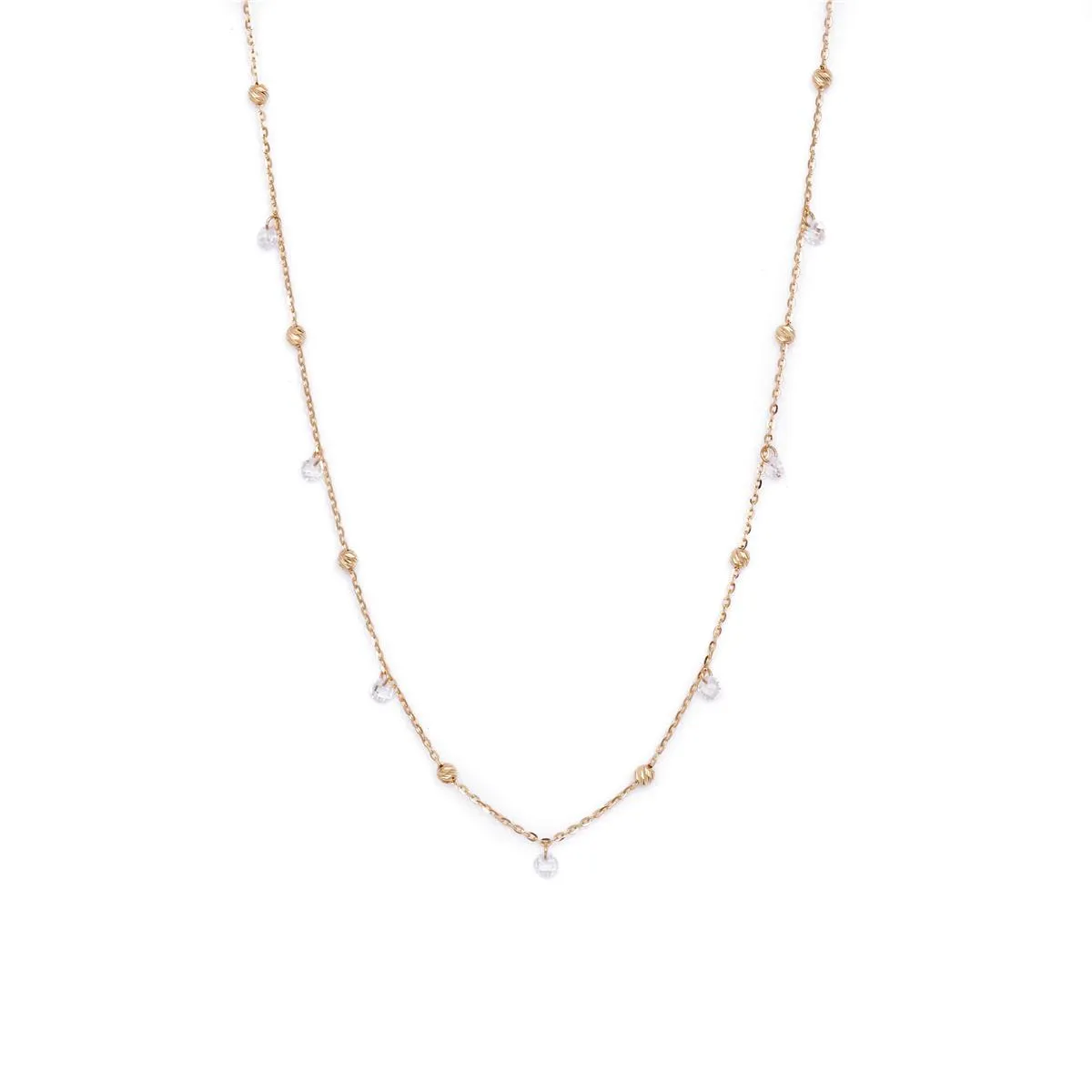 Złota celebrytka naszyjnik z kulkami i kamieniami syntetycznymi zainspirowany słonecznymi refleksami lata perfekcyjnie uzupełni kwieciste sukienki w stylu boho oraz inne letnie stylizacje. Białe kamyki i złote koraliki o nieregularnej fakturze zawieszono na ażurowym łańcuszku typu ankier, który idealnie podkreśla delikatny i eteryczny charakter wyjątkowej biżuterii. Poczuj ciepłe promienie słońca, dzięki temu biżuteryjnemu dodatkowi!