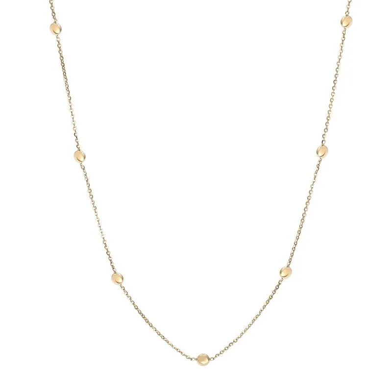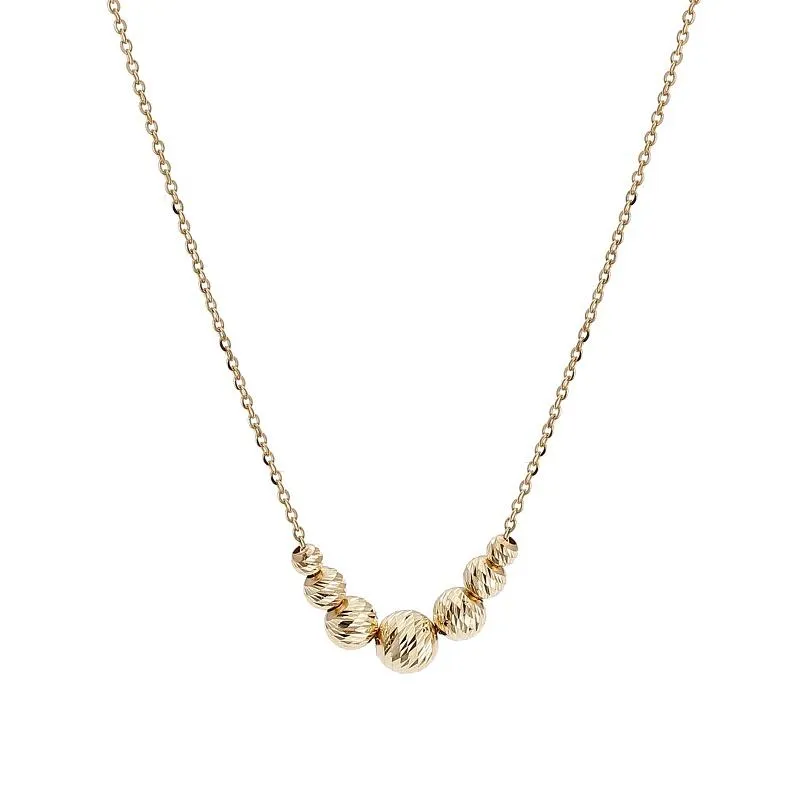 Złoty naszyjnik damski posiada delikatny łańcuszek, na którym umieszczono ozdobne koraliki w równych odstępach. Koraliki są okrągłe i mają delikatne, żłobione detale, a centralnie umieszczone koraliki tworzą punkt skupienia naszyjnika. Złote koraliki nadają naszyjnikowi eleganckiego i nowoczesnego wyglądu. Łańcuszek jest subtelny, co podkreśla delikatność całości. Naszyjnik jest bardzo lekki i wygodny do noszenia, a wykończenie jest gładkie i polerowane, co dodaje mu blasku. Zapięcie typu karabińczyk jest łatwe w obsłudze, co czyni go praktycznym i wygodnym dodatkiem. Jest to idealny dodatek do codziennych stylizacji oraz na specjalne okazje. W ofercie Blue Topaz znajdziesz również pasujące kolczyki i bransoletkę.