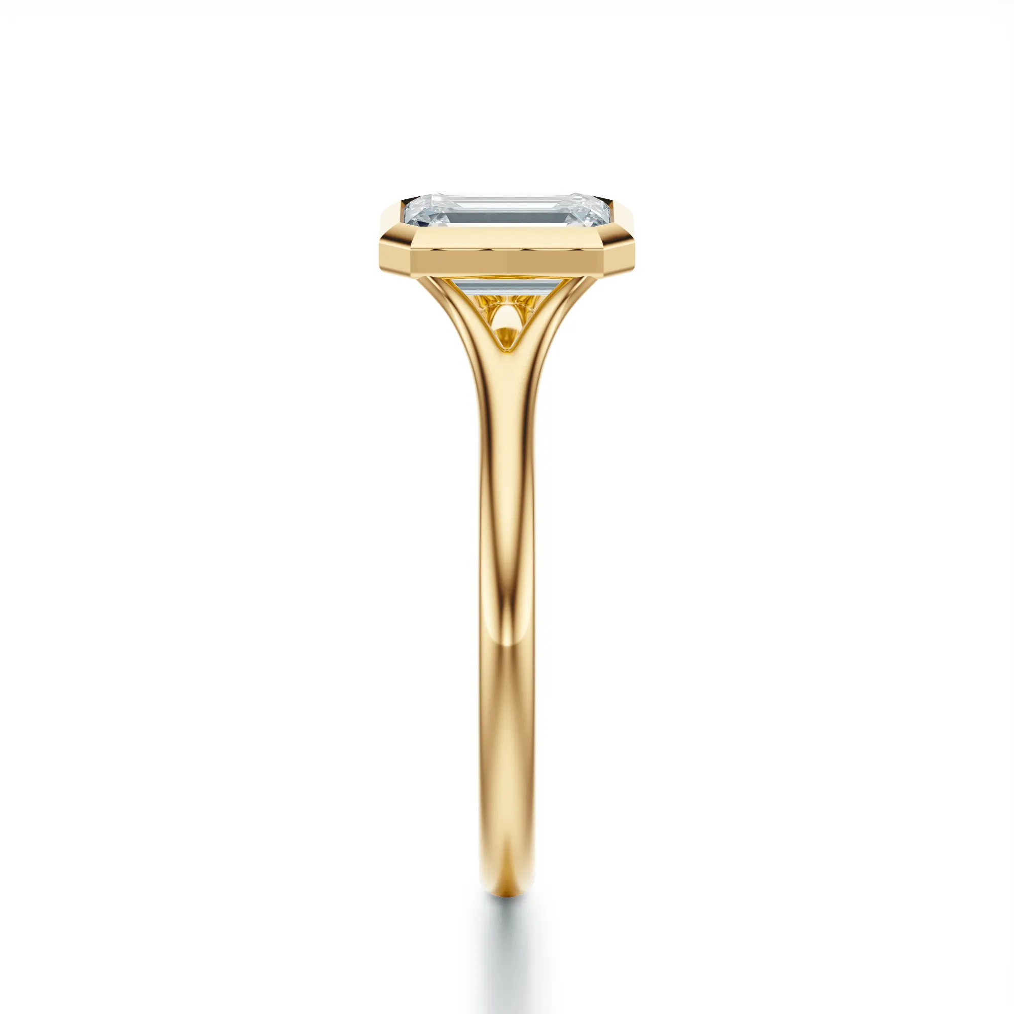 Ten pierścionek zaręczynowy wykonany ze złota o próbie 585 w odcieniu klasycznego żółtego złota emanuje subtelną elegancją i ponadczasowym stylem. Osadzony centralnie diament o szmaragdowym szlifie przyciąga uwagę swoją geometryczną precyzją i lustrem czystego blasku. Otoczony prostą, nowoczesną oprawą, tworzy spójną całość, która doskonale balansuje pomiędzy minimalistycznym designem a luksusowym wykończeniem.