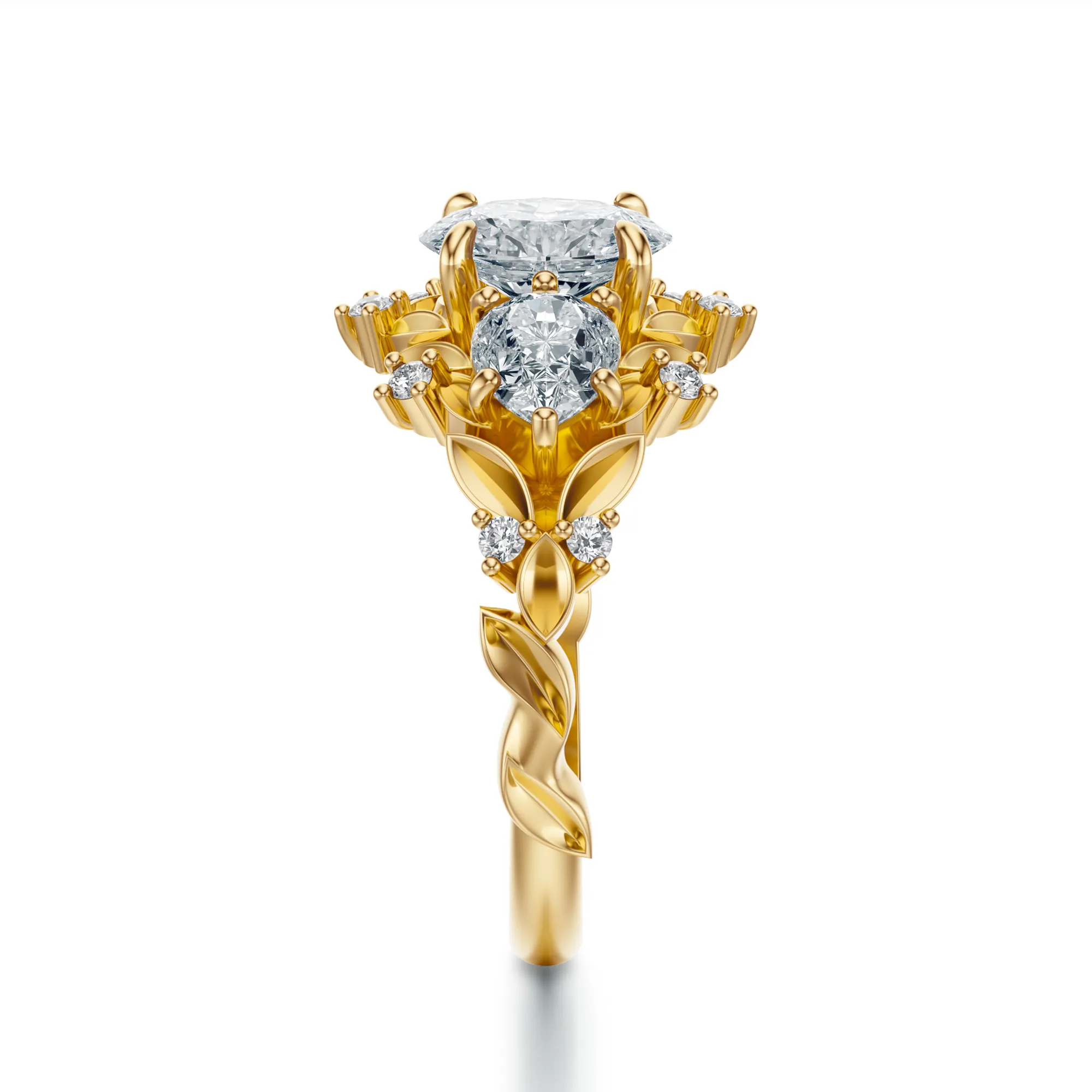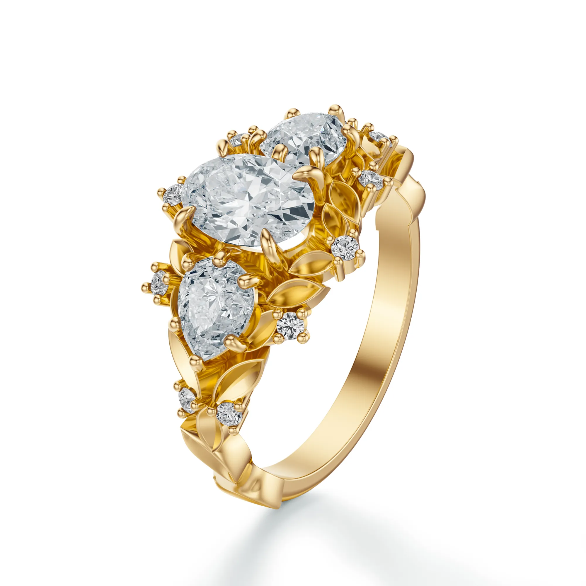Ten zjawiskowy pierścionek wykonany ze złota o próbie 585 w kolorze żółtym zachwyca bogactwem detali i kunsztownym wykończeniem. Połączenie intensywnego blasku diamentów z misterną oprawą o florystycznym motywie tworzy kompozycję pełną wyrafinowania i klasy. Trzy główne kamienie – centralny o owalnym kształcie oraz dwa w szlifie gruszki – dopełniają całości, tworząc wyjątkowo harmonijną formę.