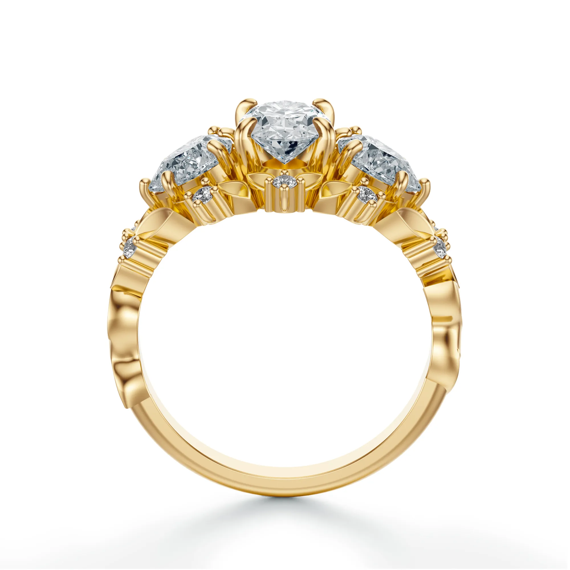 Bogato zdobiona obrączka z subtelnymi liściowymi elementami oraz drobnymi, okrągłymi diamentami nadaje pierścionkowi artystyczny i lekko vintage’owy charakter. Idealny dla kobiet o romantycznym usposobieniu, ceniących biżuterię z duszą i niepowtarzalnym stylem. Symbolika trzech kamieni często interpretowana jest jako przeszłość, teraźniejszość i przyszłość – idealne przesłanie dla pierścionka zaręczynowego, który ma upamiętniać najważniejsze chwile w związku.