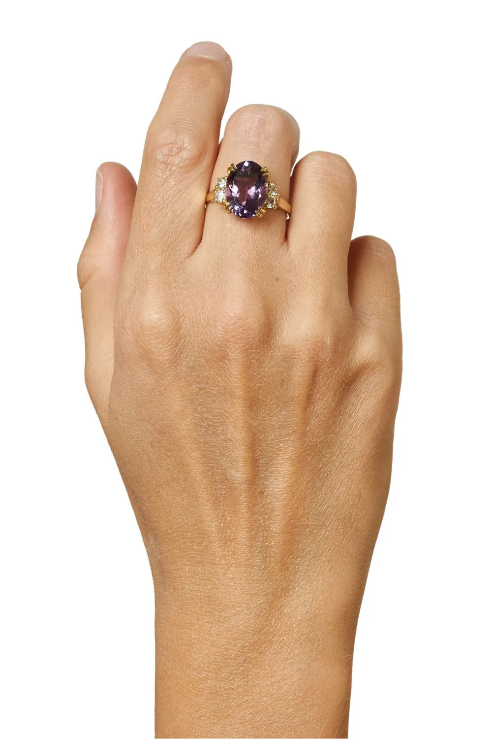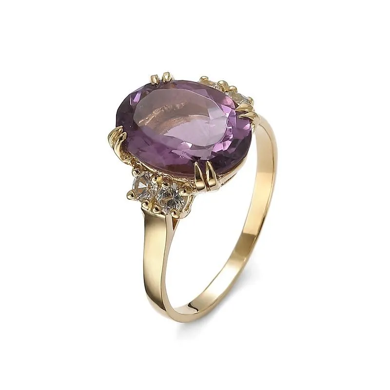 Na zdjęciu przedstawiamy piękny złoty pierścionek z ametystem i szafirami. Ciężko jest wyobrazić sobie lepsze połączenie, które tak skutecznie się uzupełnia, a jednocześnie harmonijnie współgra. Ametyst w tym złotym pierścionku jest owalnego kształtu. Kunsztowny szlif sprawia, że mieni się w każdym świetle. Dodatkową ozdobą kamienia są podwójne łapki, w które został osadzony. Złoto cudownie współgra z fioletem ametystu. Jednak nie tylko ametyst w tym wyrobie ma swoją rolę. Złoty pierścionek z ametystem uzupełniają białe szafiry. Oba rodzaje kamieni mają kolor, cechy i szlif odbijający światło, więc całość w złotej oprawie i na złotej, gładkim obrączce wygląda naprawdę imponująco.