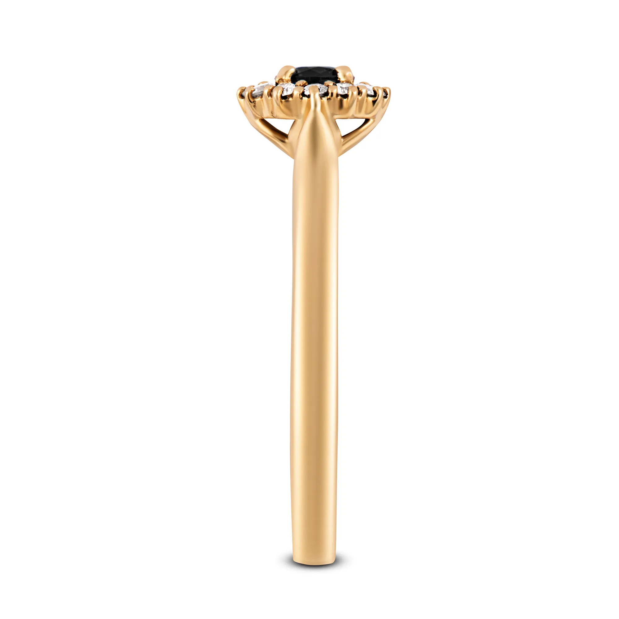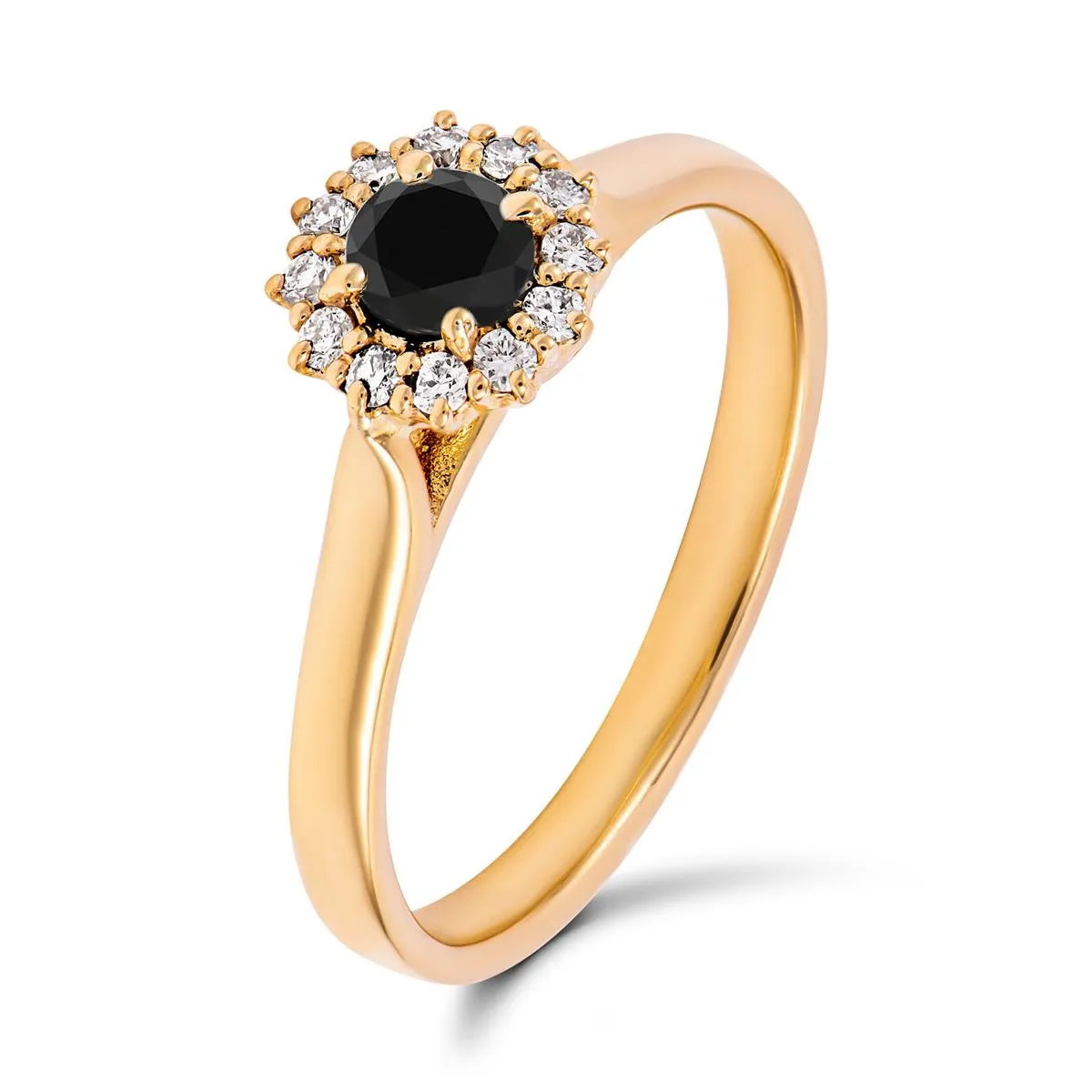 Pierścionek z czarnym diamentem stanowi połączenie wyraźnych kontrastów. Prezentowany centralny kamień w towarzystwie klasycznych diamentów, tworzy niezwykle oryginalne dzieło jubilerskie. Czarny diament stanowi serce tego pierścionka. Jest on większy od otaczających go tradycyjnych diamentów ułożonych na kształt okręgu, co podkreśla jego charakter. Wszystko to osadzone zostało na gładkiej obrączce, wykonanej z klasycznego, żółtego złota w próbie 585.