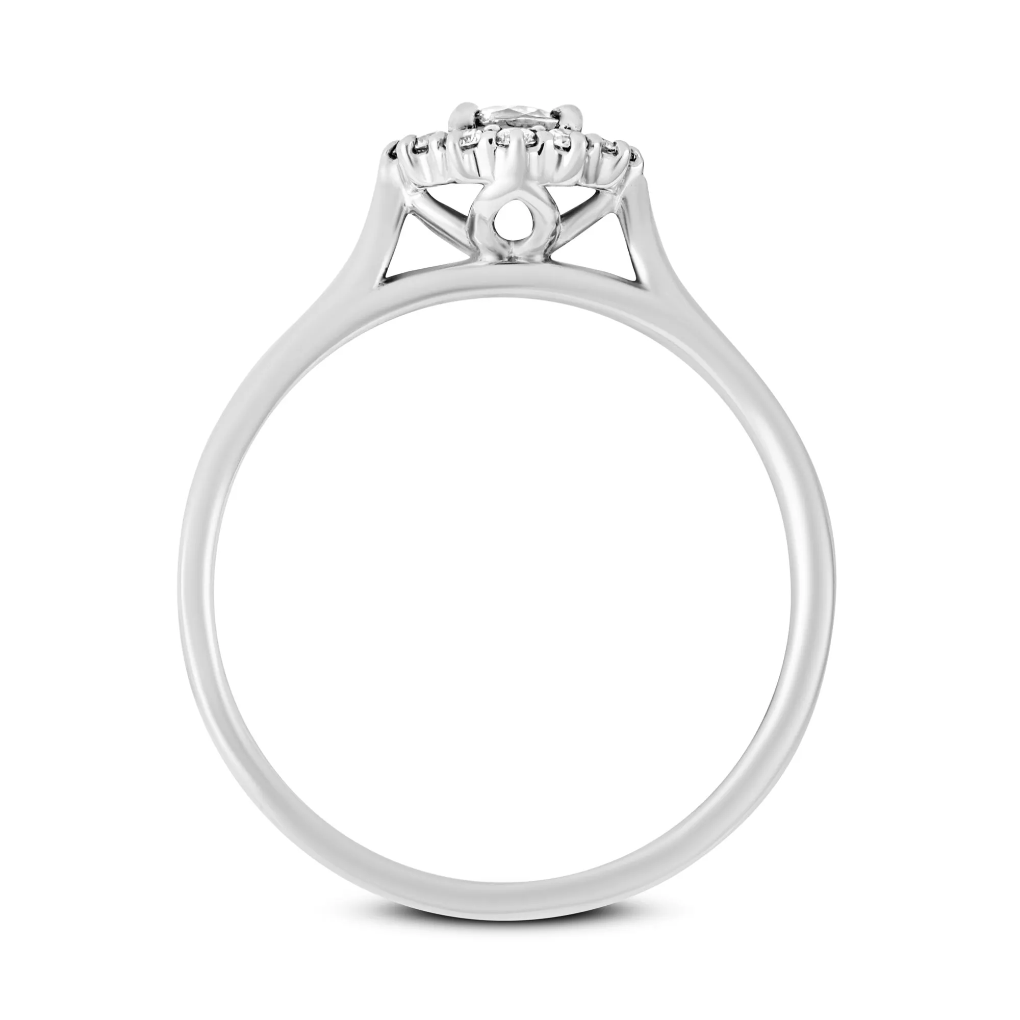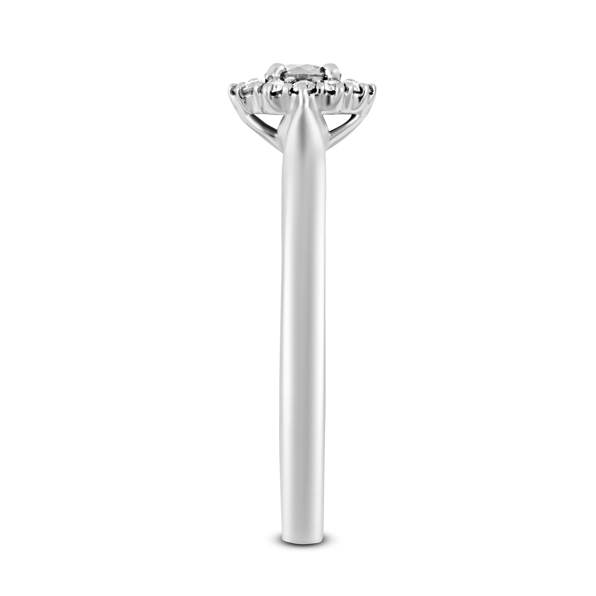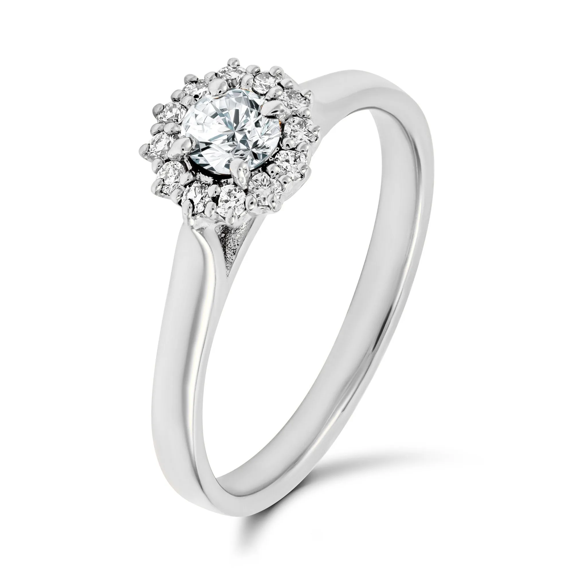 Białe złoto wybierane jest niezwykle często, szczególnie wśród osób preferujących srebrne dodatki. Diamenty oprawiane są w srebro rzadko, dlatego też alternatywą i o wiele cenniejszym zamiennikiem jest właśnie białe złoto. Ten pierścionek z diamentami z białego złota jest zachwycająco kobiecy i klasyczny.Pierścionek posiada jednolitą, gładką obrączkę i kunsztownie osadzone diamenty. W centralnym punkcie znajduje się większy, okrągły diament, a wokół niego mniejsze kamienie o diamentowym szlifie. Całość emanuje blaskiem w świetle dziennym, jak i sztucznym. Niczym niezakłócony połysk białego złota, które harmonijnie pasuje do jasnych diamentów w rezultacie tworzy efekt pięknie prezentującej ozdoby na kobiecej dłoni.