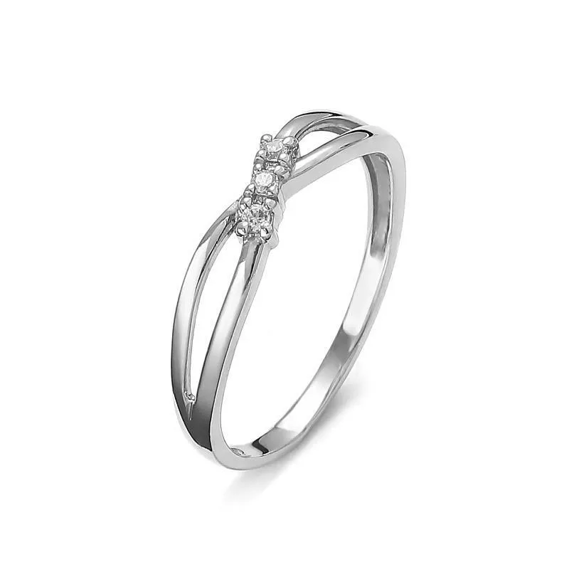 Szukasz pomysłu na obrączkę ślubną, która będzie oryginalna i nietuzinkowa? A może lubisz pierścionki o kształcie obrączki i chcesz uzupełnić swoją kolekcję o nowy model? Bez względu na powód ten pierścionek z białego złota z diamentami z pewnością Ci się spodoba.Charakteryzuje się niezwykle delikatną formą, a dokładniej pięknie dopracowanym splotem górnej części pierścionka gdzie dwie cienkie obręcze krzyżują się na środku. Jedna z nich ozdobiona jest trzema drobnymi diamentami.