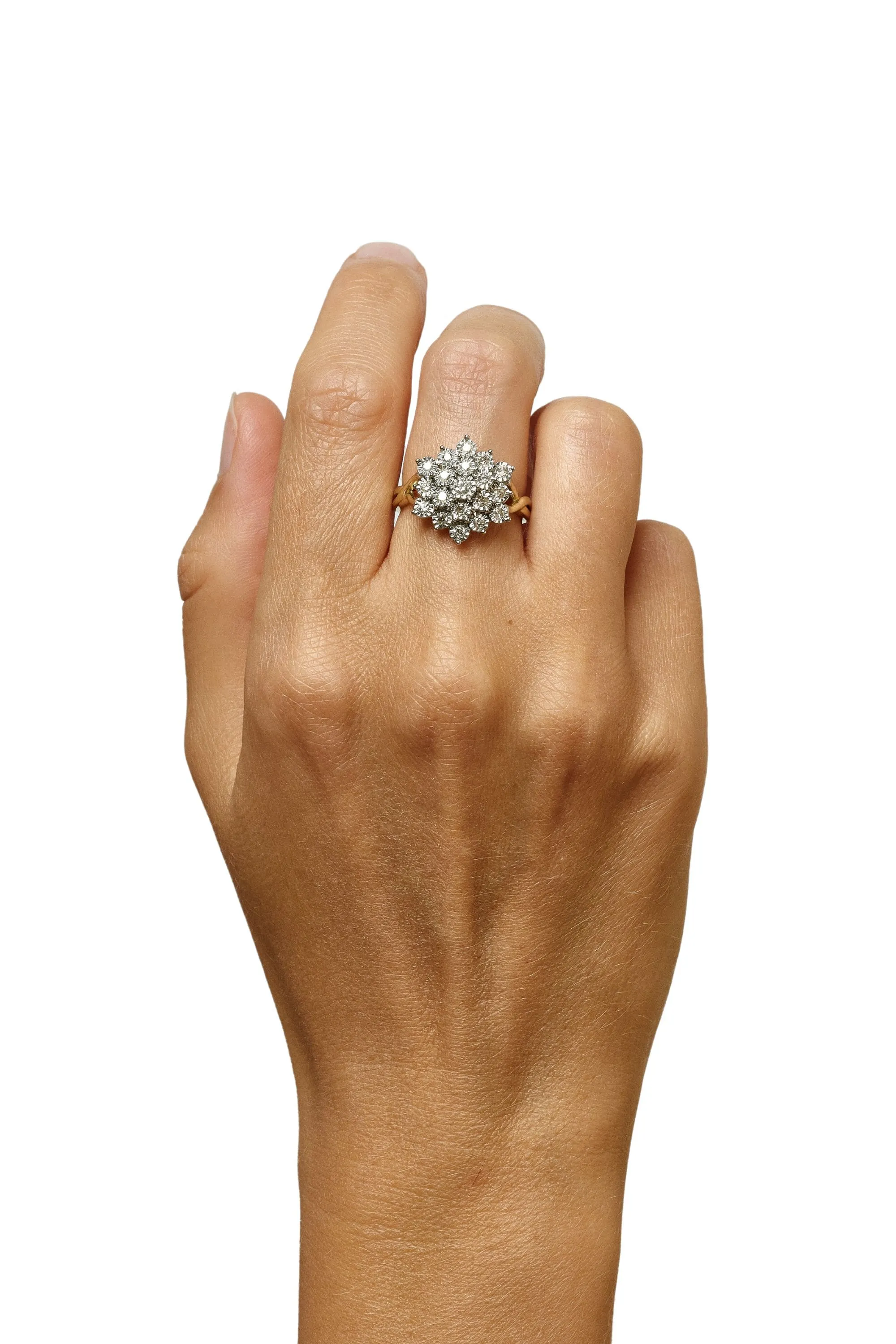 Złoty pierścionek z diamentami wykonany z żółtego złota wyróżnia się nietuzinkowym designem już na etapie obrączki. Obrączka, tuż przy rozecie z diamentów rozwidla się, tworząc piękny splot, który subtelnie akcentuje najistotniejszy element pierścionka. Rozetę tworzą mniejsze diamenty osadzone wokół centralnego kamienia o większej średnicy. Łapki wykonane są z białego złota, co nie zakłóca jasnego blasku ozdoby pierścionka i sprawia, że jest idealnym dodatkiem na wieczorne wyjścia.