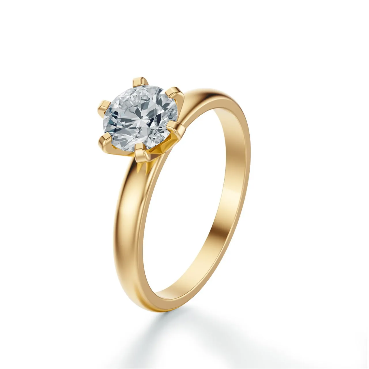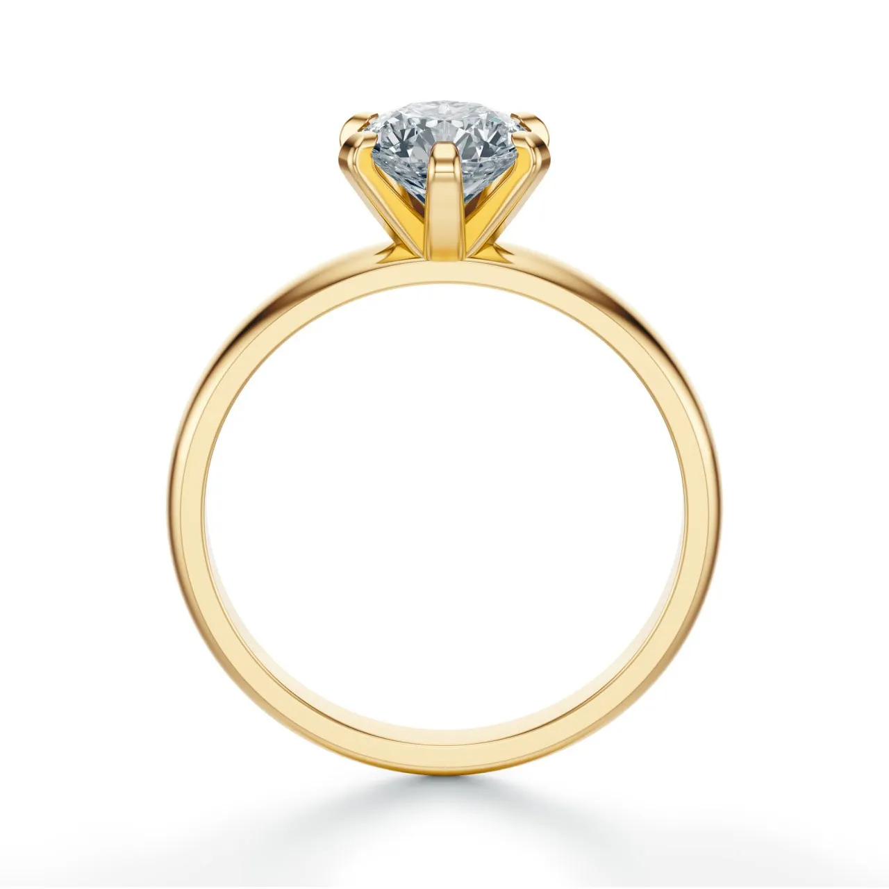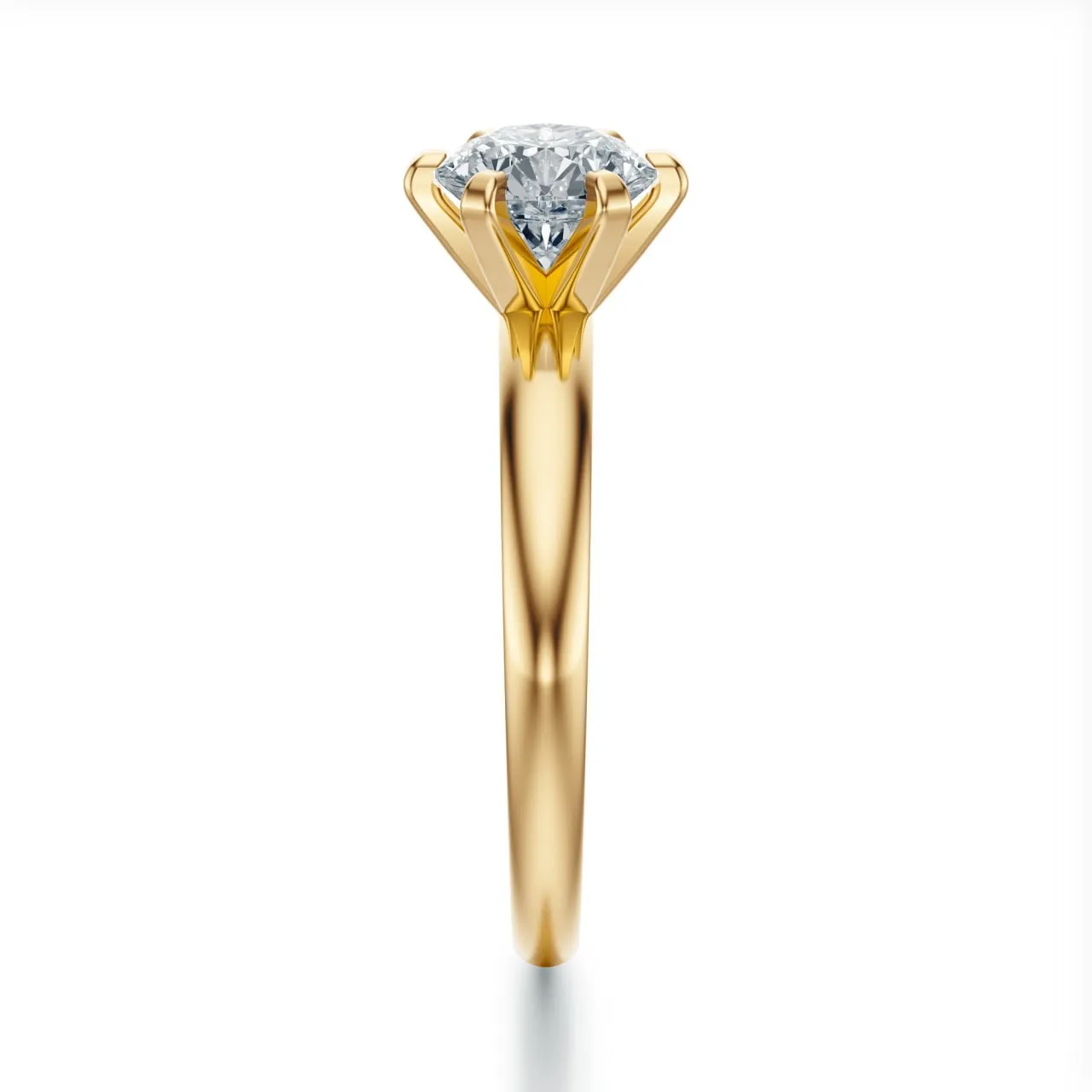 Centralnym punktem tego pierścionka jest okrągły brylant o idealnym szlifie, osadzony w klasycznej koronie z sześcioma łapkami. Ten układ podkreśla naturalny blask kamienia, pozwalając światłu swobodnie przenikać przez fasety diamentu. Prosta, smukła obrączka pięknie eksponuje centralny kamień, dzięki czemu całość wygląda lekko i harmonijnie.