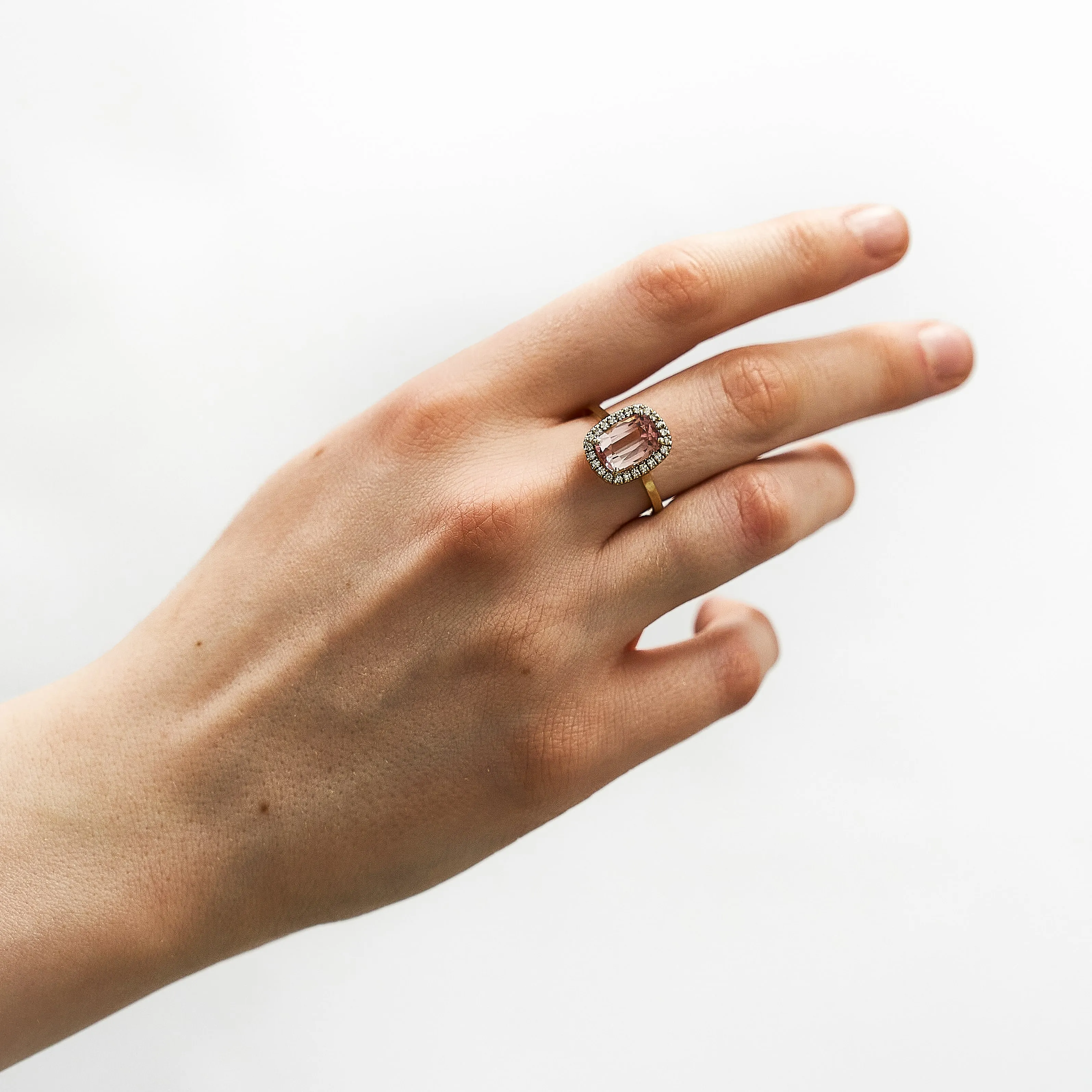Blask, który roztacza różowy turmalin, wzmacnia zastosowanie w projekcie diamentów. Turmalin różowy w otoczeniu diamentów optymalnie wykorzystuje promienie światła naturalnego oraz odbija sztuczne światło, akcentując piękną kobiecą dłoń.