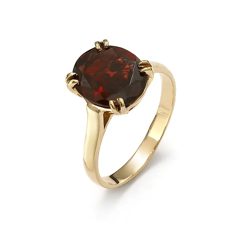Granat, czyli kamień o krwistoczerwonej barwie to kamień szlachetny, doskonale nadający się do wyrobów jubilerskich, ponieważ podkreśla piękno złota oraz srebra. W przypadku tego projektu – złotego pierścionka z granatem wykorzystane zostało klasyczne żółte złoto.