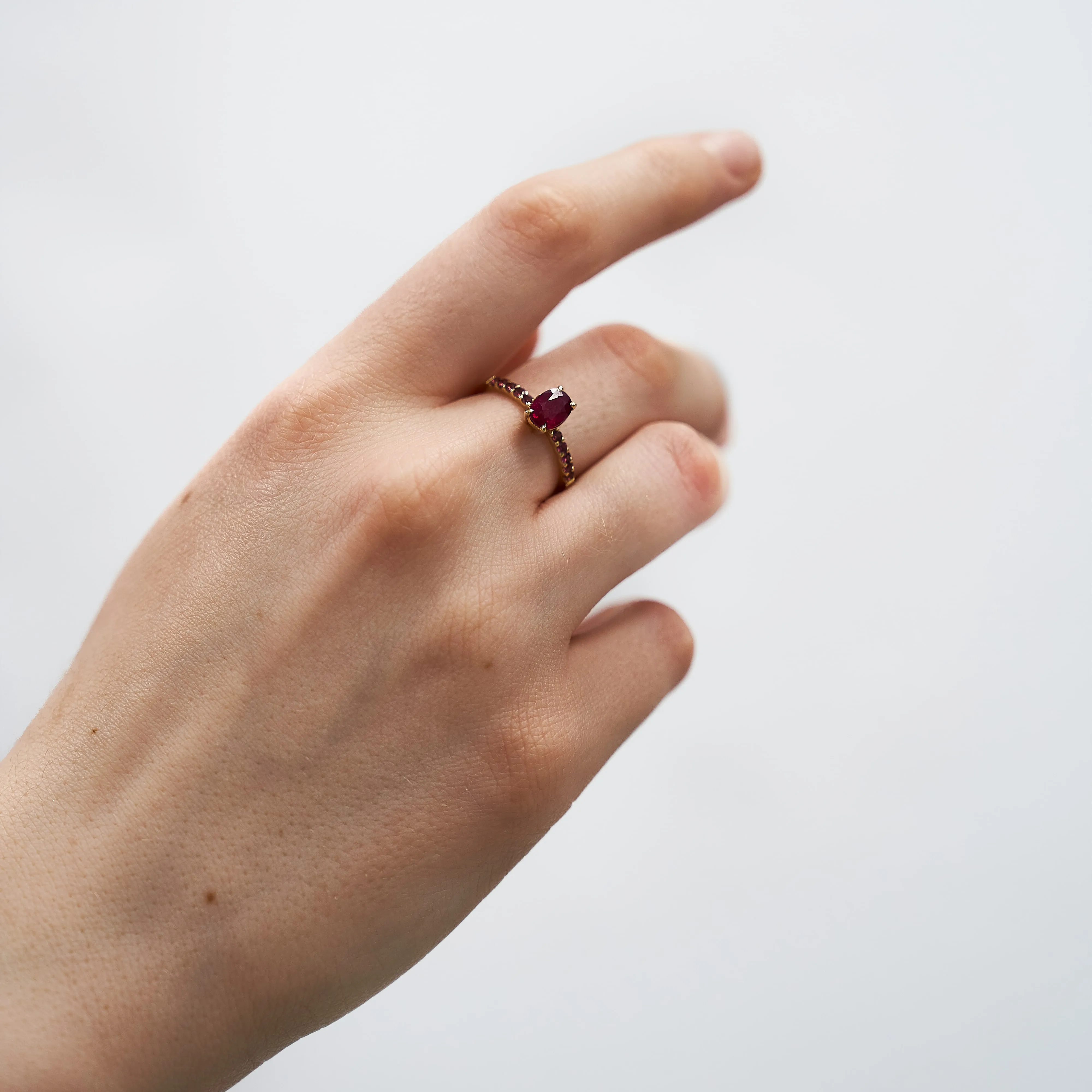 W tym modelu centralnie usytuowany rubin w czteroramiennej koronie akcentują dodatkowo drobne granaty na obrączce po obu stronach głównego kamienia. Pięć niewielkiej wielkości granatów zdobią całą zewnętrzną część palca, podkreślając piękno kobiecej dłoni.